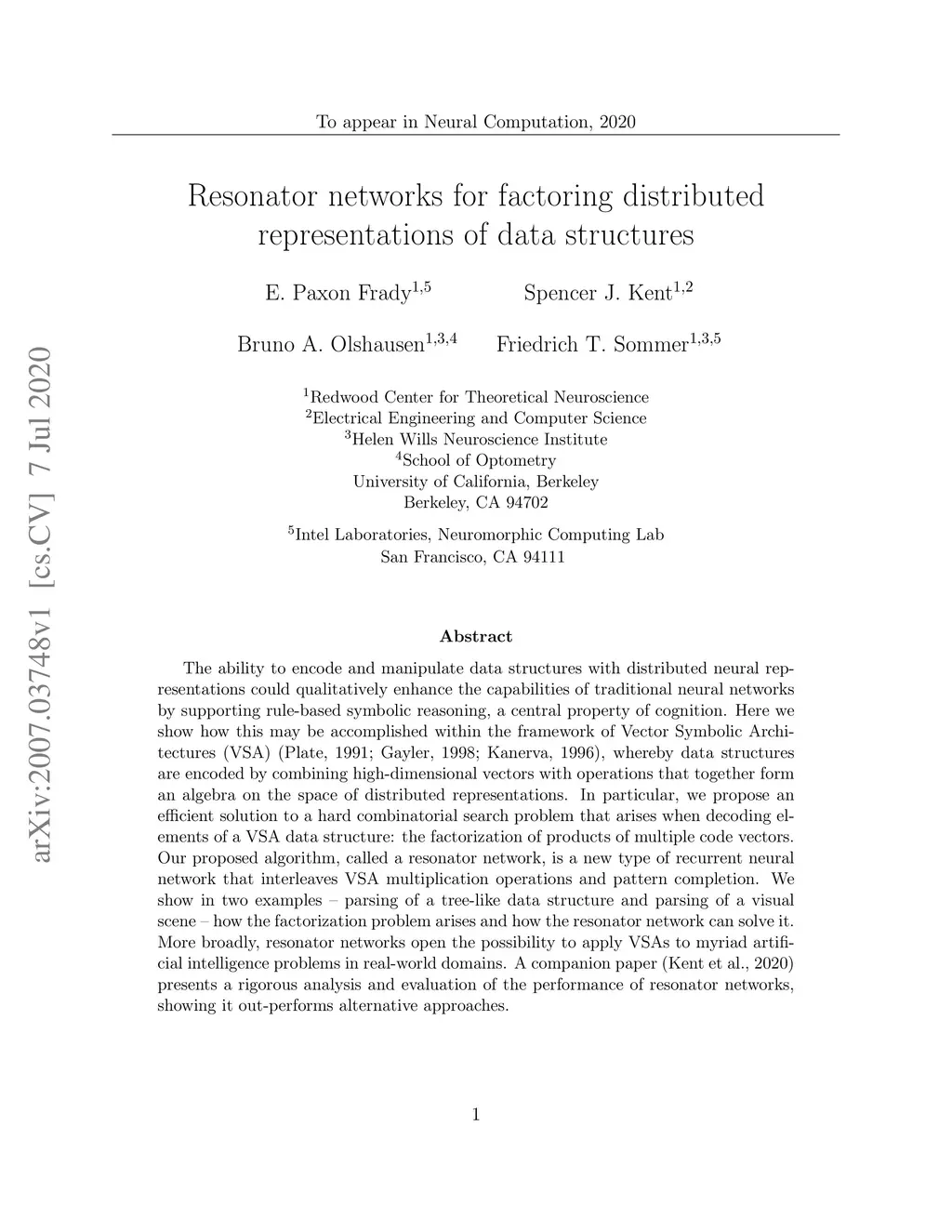 The ability to encode and manipulate data structures with distributed neural representations could qualitatively enhance the capabilities of traditional neural networks by supporting rule-based symbolic reasoning, a central property of cognition. Here we show how this may be accomplished within the framework of Vector Symbolic Architectures (VSA) (Plate, 1991; Gayler, 1998; Kanerva, 1996), whereby data structures are encoded by combining high-dimensional vectors with operations that together form an algebra on the space of distributed representations. In particular, we propose an efficient solution to a hard combinatorial search problem that arises when decoding elements of a VSA data structure: the factorization of products of multiple code vectors. Our proposed algorithm, called a resonator network, is a new type of recurrent neural network that interleaves VSA multiplication operations and pattern completion. We show in two examples -- parsing of a tree-like data structure and parsing of a visual scene -- how the factorization problem arises and how the resonator network can solve it. More broadly, resonator networks open the possibility to apply VSAs to myriad artificial intelligence problems in real-world domains. A companion paper (Kent et al., 2020) presents a rigorous analysis and evaluation of the performance of resonator networks, showing it out-performs alternative approaches.