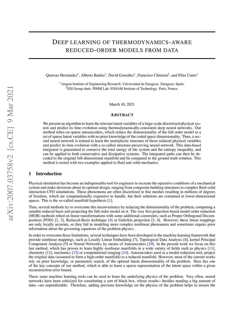 We present an algorithm to learn the relevant latent variables of a large-scale discretized physical system and predict its time evolution using thermodynamically-consistent deep neural networks. Our method relies on sparse autoencoders, which reduce the dimensionality of the full order model to a set of sparse latent variables with no prior knowledge of the coded space dimensionality. Then, a second neural network is trained to learn the metriplectic structure of those reduced physical variables and predict its time evolution with a so-called structure-preserving neural network. This data-based integrator is guaranteed to conserve the total energy of the system and the entropy inequality, and can be applied to both conservative and dissipative systems. The integrated paths can then be decoded to the original full-dimensional manifold and be compared to the ground truth solution. This method is tested with two examples applied to fluid and solid mechanics.