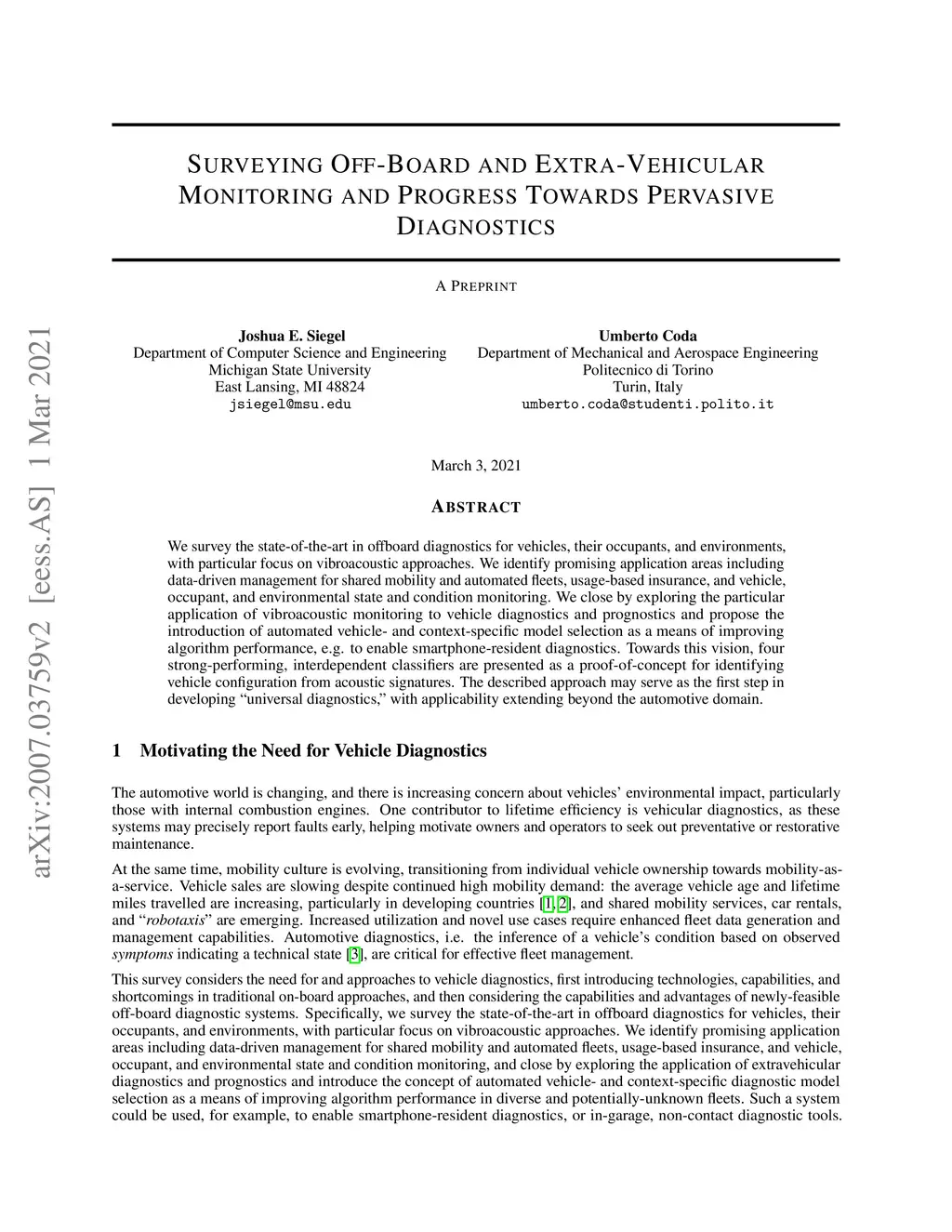 We survey the state-of-the-art in offboard diagnostics for vehicles, their occupants, and environments, with particular focus on vibroacoustic approaches. We identify promising application areas including data-driven management for shared mobility and automated fleets, usage-based insurance, and vehicle, occupant, and environmental state and condition monitoring. We close by exploring the particular application of vibroacoustic monitoring to vehicle diagnostics and prognostics and propose the introduction of automated vehicle- and context-specific model selection as a means of improving algorithm performance, e.g. to enable smartphone-resident diagnostics. Towards this vision, four strong-performing, interdependent classifiers are presented as a proof-of-concept for identifying vehicle configuration from acoustic signatures. The described approach may serve as the first step in developing "universal diagnostics," with applicability extending beyond the automotive domain.