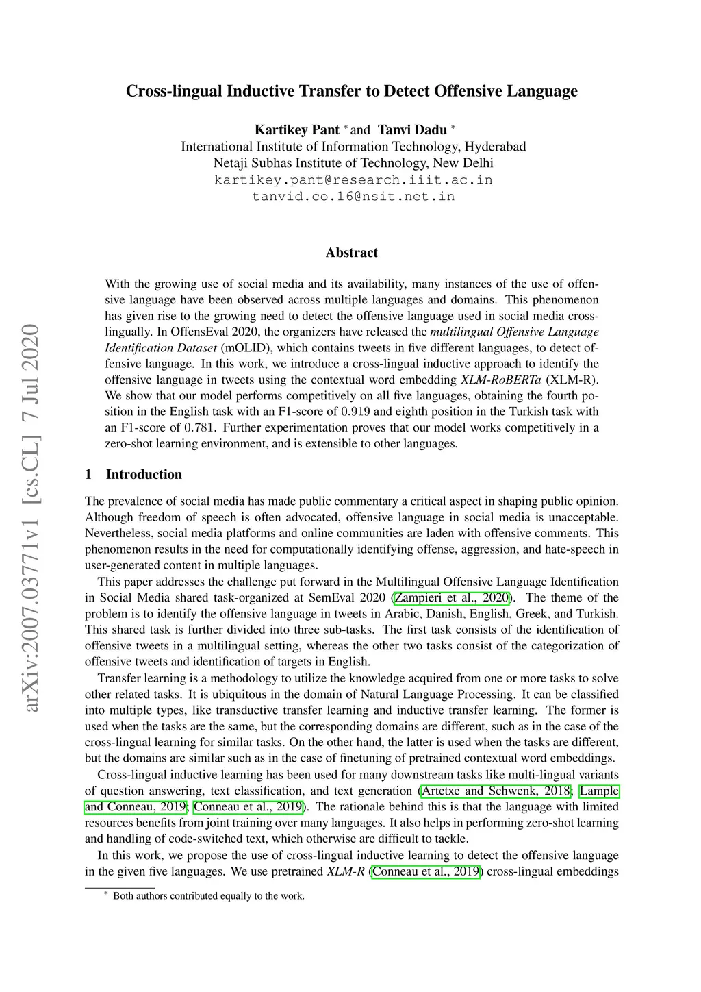 With the growing use of social media and its availability, many instances of the use of offensive language have been observed across multiple languages and domains. This phenomenon has given rise to the growing need to detect the offensive language used in social media cross-lingually. In OffensEval 2020, the organizers have released the \textit{multilingual Offensive Language Identification Dataset} (mOLID), which contains tweets in five different languages, to detect offensive language. In this work, we introduce a cross-lingual inductive approach to identify the offensive language in tweets using the contextual word embedding \textit{XLM-RoBERTa} (XLM-R). We show that our model performs competitively on all five languages, obtaining the fourth position in the English task with an F1-score of and eighth position in the Turkish task with an F1-score of . Further experimentation proves that our model works competitively in a zero-shot learning environment, and is extensible to other languages.