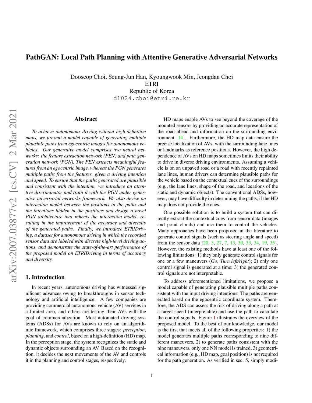 To achieve autonomous driving without high-definition maps, we present a model capable of generating multiple plausible paths from egocentric images for autonomous vehicles. Our generative model comprises two neural networks: the feature extraction network (FEN) and path generation network (PGN). The FEN extracts meaningful features from an egocentric image, whereas the PGN generates multiple paths from the features, given a driving intention and speed. To ensure that the paths generated are plausible and consistent with the intention, we introduce an attentive discriminator and train it with the PGN under generative adversarial networks framework. We also devise an interaction model between the positions in the paths and the intentions hidden in the positions and design a novel PGN architecture that reflects the interaction model, resulting in the improvement of the accuracy and diversity of the generated paths. Finally, we introduce ETRIDriving, a dataset for autonomous driving in which the recorded sensor data are labeled with discrete high-level driving actions, and demonstrate the state-of-the-art performance of the proposed model on ETRIDriving in terms of accuracy and diversity.