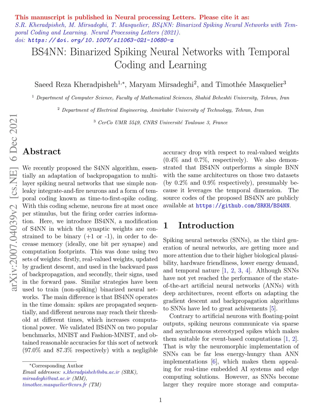 BS4NN: Binarized Spiking Neural Networks with Temporal Coding and