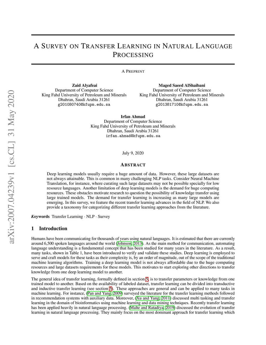 Deep learning models usually require a huge amount of data. However, these large datasets are not always attainable. This is common in many challenging NLP tasks. Consider Neural Machine Translation, for instance, where curating such large datasets may not be possible specially for low resource languages. Another limitation of deep learning models is the demand for huge computing resources. These obstacles motivate research to question the possibility of knowledge transfer using large trained models. The demand for transfer learning is increasing as many large models are emerging. In this survey, we feature the recent transfer learning advances in the field of NLP. We also provide a taxonomy for categorizing different transfer learning approaches from the literature.