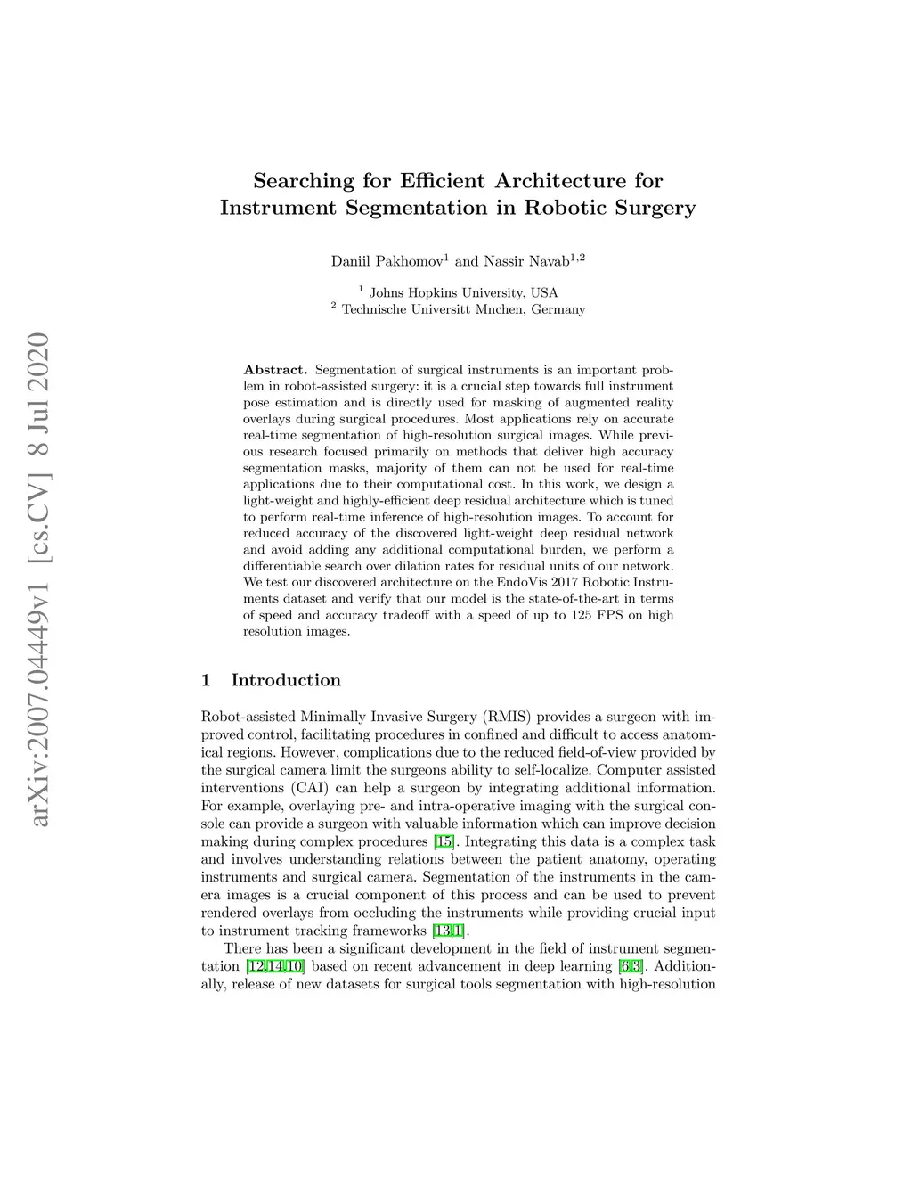 Segmentation of surgical instruments is an important problem in robot-assisted surgery: it is a crucial step towards full instrument pose estimation and is directly used for masking of augmented reality overlays during surgical procedures. Most applications rely on accurate real-time segmentation of high-resolution surgical images. While previous research focused primarily on methods that deliver high accuracy segmentation masks, majority of them can not be used for real-time applications due to their computational cost. In this work, we design a light-weight and highly-efficient deep residual architecture which is tuned to perform real-time inference of high-resolution images. To account for reduced accuracy of the discovered light-weight deep residual network and avoid adding any additional computational burden, we perform a differentiable search over dilation rates for residual units of our network. We test our discovered architecture on the EndoVis 2017 Robotic Instruments dataset and verify that our model is the state-of-the-art in terms of speed and accuracy tradeoff with a speed of up to 125 FPS on high resolution images.