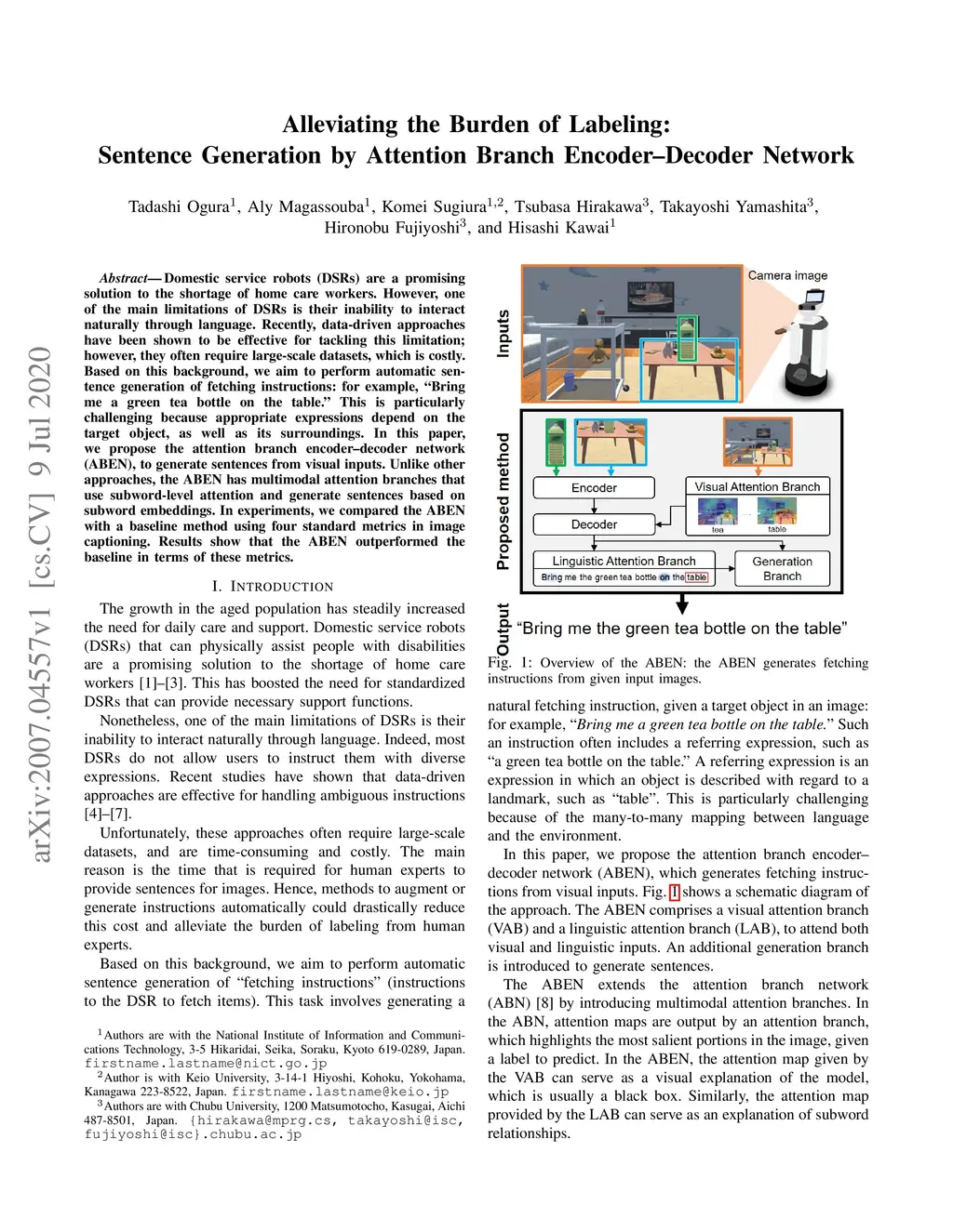 Domestic service robots (DSRs) are a promising solution to the shortage of home care workers. However, one of the main limitations of DSRs is their inability to interact naturally through language. Recently, data-driven approaches have been shown to be effective for tackling this limitation; however, they often require large-scale datasets, which is costly. Based on this background, we aim to perform automatic sentence generation of fetching instructions: for example, "Bring me a green tea bottle on the table." This is particularly challenging because appropriate expressions depend on the target object, as well as its surroundings. In this paper, we propose the attention branch encoder--decoder network (ABEN), to generate sentences from visual inputs. Unlike other approaches, the ABEN has multimodal attention branches that use subword-level attention and generate sentences based on subword embeddings. In experiments, we compared the ABEN with a baseline method using four standard metrics in image captioning. Results show that the ABEN outperformed the baseline in terms of these metrics.