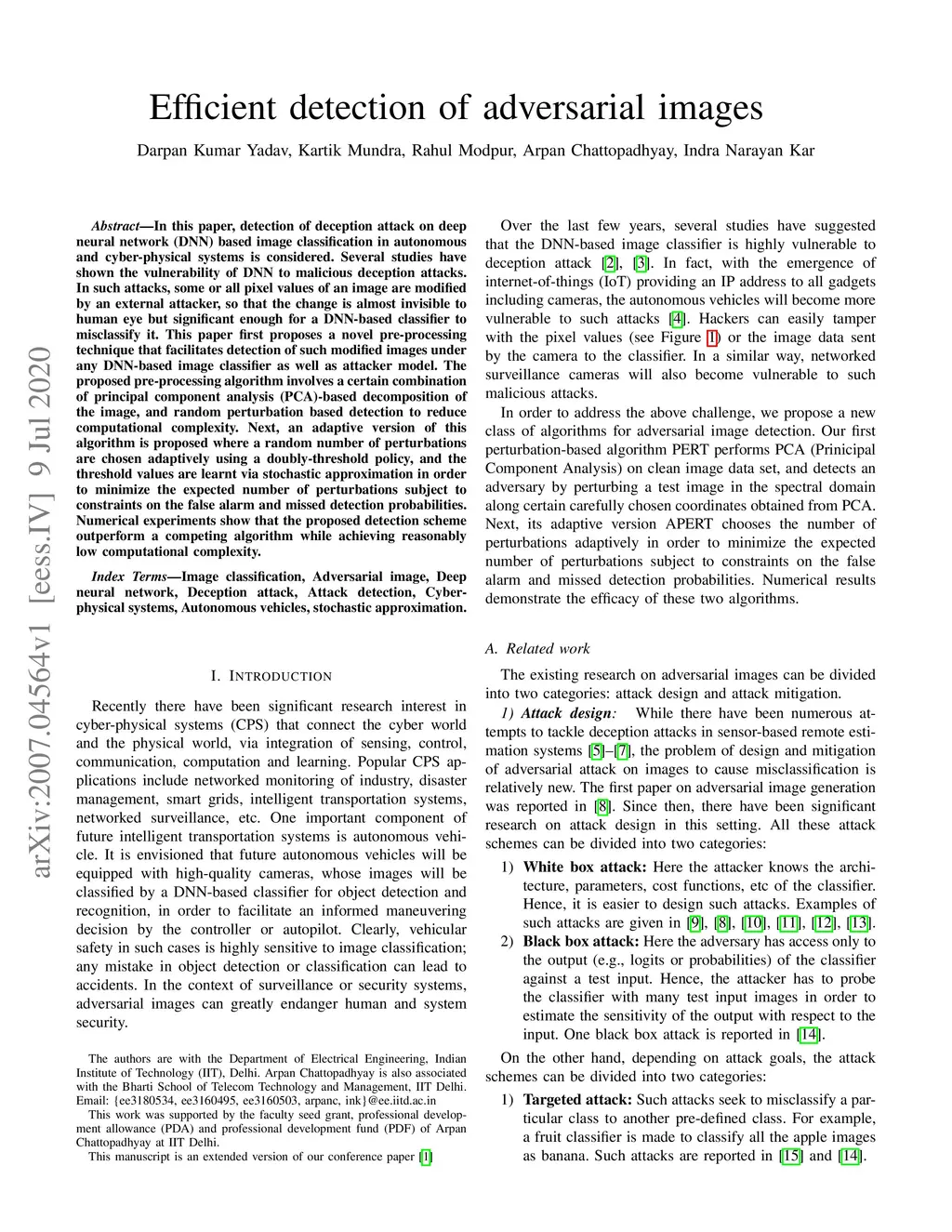 In this paper, detection of deception attack on deep neural network (DNN) based image classification in autonomous and cyber-physical systems is considered. Several studies have shown the vulnerability of DNN to malicious deception attacks. In such attacks, some or all pixel values of an image are modified by an external attacker, so that the change is almost invisible to the human eye but significant enough for a DNN-based classifier to misclassify it. This paper first proposes a novel pre-processing technique that facilitates the detection of such modified images under any DNN-based image classifier as well as the attacker model. The proposed pre-processing algorithm involves a certain combination of principal component analysis (PCA)-based decomposition of the image, and random perturbation based detection to reduce computational complexity. Next, an adaptive version of this algorithm is proposed where a random number of perturbations are chosen adaptively using a doubly-threshold policy, and the threshold values are learnt via stochastic approximation in order to minimize the expected number of perturbations subject to constraints on the false alarm and missed detection probabilities. Numerical experiments show that the proposed detection scheme outperforms a competing algorithm while achieving reasonably low computational complexity.