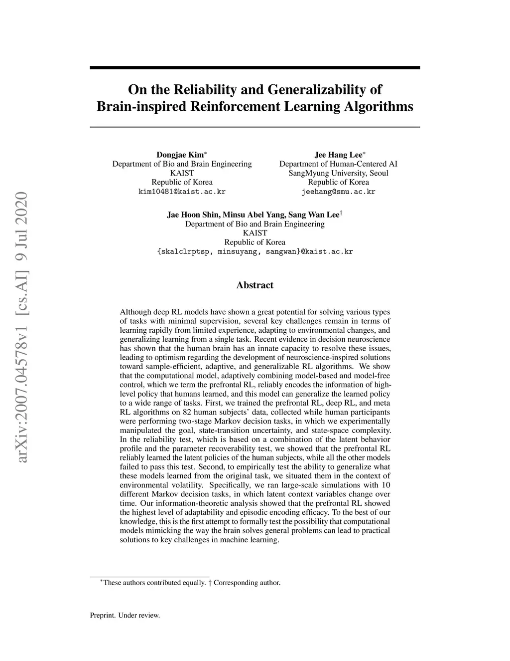 Although deep RL models have shown a great potential for solving various types of tasks with minimal supervision, several key challenges remain in terms of learning from limited experience, adapting to environmental changes, and generalizing learning from a single task. Recent evidence in decision neuroscience has shown that the human brain has an innate capacity to resolve these issues, leading to optimism regarding the development of neuroscience-inspired solutions toward sample-efficient, and generalizable RL algorithms. We show that the computational model combining model-based and model-free control, which we term the prefrontal RL, reliably encodes the information of high-level policy that humans learned, and this model can generalize the learned policy to a wide range of tasks. First, we trained the prefrontal RL, and deep RL algorithms on 82 subjects' data, collected while human participants were performing two-stage Markov decision tasks, in which we manipulated the goal, state-transition uncertainty and state-space complexity. In the reliability test, which includes the latent behavior profile and the parameter recoverability test, we showed that the prefrontal RL reliably learned the latent policies of the humans, while all the other models failed. Second, to test the ability to generalize what these models learned from the original task, we situated them in the context of environmental volatility. Specifically, we ran large-scale simulations with 10 Markov decision tasks, in which latent context variables change over time. Our information-theoretic analysis showed that the prefrontal RL showed the highest level of adaptability and episodic encoding efficacy. This is the first attempt to formally test the possibility that computational models mimicking the way the brain solves general problems can lead to practical solutions to key challenges in machine learning.