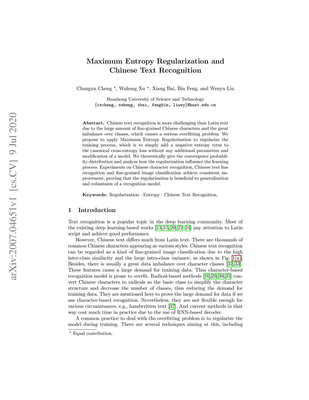 Maximum Entropy Regularization and Chinese Text Recognition