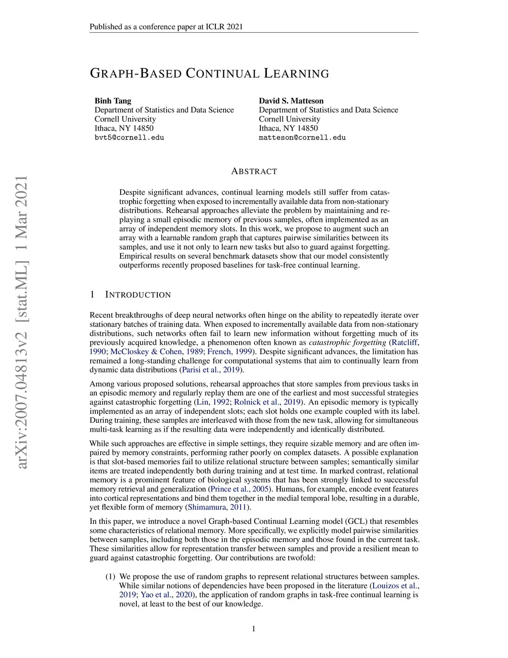 Despite significant advances, continual learning models still suffer from catastrophic forgetting when exposed to incrementally available data from non-stationary distributions. Rehearsal approaches alleviate the problem by maintaining and replaying a small episodic memory of previous samples, often implemented as an array of independent memory slots. In this work, we propose to augment such an array with a learnable random graph that captures pairwise similarities between its samples, and use it not only to learn new tasks but also to guard against forgetting. Empirical results on several benchmark datasets show that our model consistently outperforms recently proposed baselines for task-free continual learning.