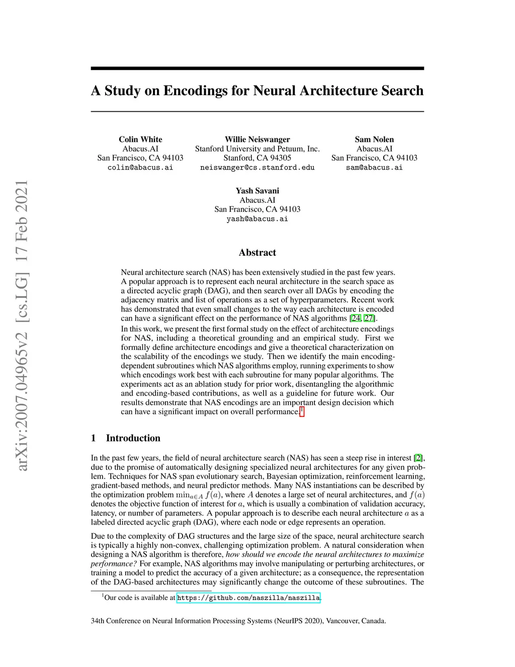Neural architecture search (NAS) has been extensively studied in the past few years. A popular approach is to represent each neural architecture in the search space as a directed acyclic graph (DAG), and then search over all DAGs by encoding the adjacency matrix and list of operations as a set of hyperparameters. Recent work has demonstrated that even small changes to the way each architecture is encoded can have a significant effect on the performance of NAS algorithms. In this work, we present the first formal study on the effect of architecture encodings for NAS, including a theoretical grounding and an empirical study. First we formally define architecture encodings and give a theoretical characterization on the scalability of the encodings we study Then we identify the main encoding-dependent subroutines which NAS algorithms employ, running experiments to show which encodings work best with each subroutine for many popular algorithms. The experiments act as an ablation study for prior work, disentangling the algorithmic and encoding-based contributions, as well as a guideline for future work. Our results demonstrate that NAS encodings are an important design decision which can have a significant impact on overall performance. Our code is available at https://github.com/naszilla/nas-encodings.