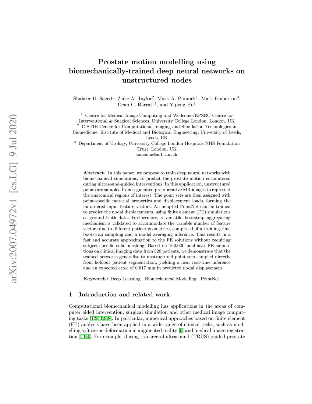 In this paper, we propose to train deep neural networks with biomechanical simulations, to predict the prostate motion encountered during ultrasound-guided interventions. In this application, unstructured points are sampled from segmented pre-operative MR images to represent the anatomical regions of interest. The point sets are then assigned with point-specific material properties and displacement loads, forming the un-ordered input feature vectors. An adapted PointNet can be trained to predict the nodal displacements, using finite element (FE) simulations as ground-truth data. Furthermore, a versatile bootstrap aggregating mechanism is validated to accommodate the variable number of feature vectors due to different patient geometries, comprised of a training-time bootstrap sampling and a model averaging inference. This results in a fast and accurate approximation to the FE solutions without requiring subject-specific solid meshing. Based on 160,000 nonlinear FE simulations on clinical imaging data from 320 patients, we demonstrate that the trained networks generalise to unstructured point sets sampled directly from holdout patient segmentation, yielding a near real-time inference and an expected error of 0.017 mm in predicted nodal displacement.
