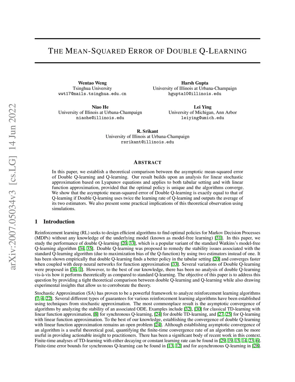 In this paper, we establish a theoretical comparison between the asymptotic mean-squared error of Double Q-learning and Q-learning. Our result builds upon an analysis for linear stochastic approximation based on Lyapunov equations and applies to both tabular setting and with linear function approximation, provided that the optimal policy is unique and the algorithms converge. We show that the asymptotic mean-squared error of Double Q-learning is exactly equal to that of Q-learning if Double Q-learning uses twice the learning rate of Q-learning and outputs the average of its two estimators. We also present some practical implications of this theoretical observation using simulations.