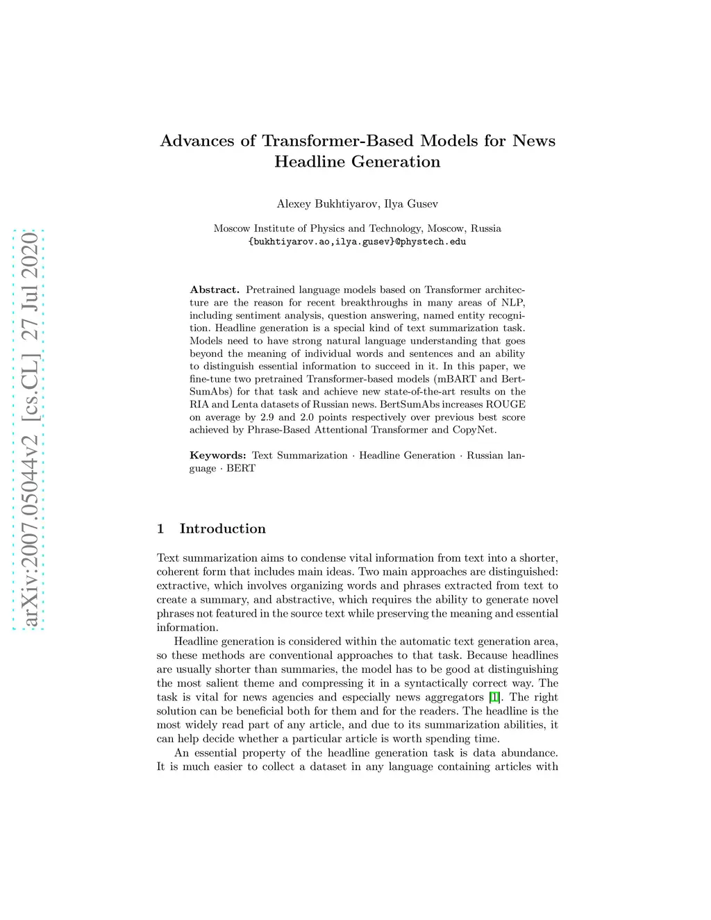 Pretrained language models based on Transformer architecture are the reason for recent breakthroughs in many areas of NLP, including sentiment analysis, question answering, named entity recognition. Headline generation is a special kind of text summarization task. Models need to have strong natural language understanding that goes beyond the meaning of individual words and sentences and an ability to distinguish essential information to succeed in it. In this paper, we fine-tune two pretrained Transformer-based models (mBART and BertSumAbs) for that task and achieve new state-of-the-art results on the RIA and Lenta datasets of Russian news. BertSumAbs increases ROUGE on average by 2.9 and 2.0 points respectively over previous best score achieved by Phrase-Based Attentional Transformer and CopyNet.