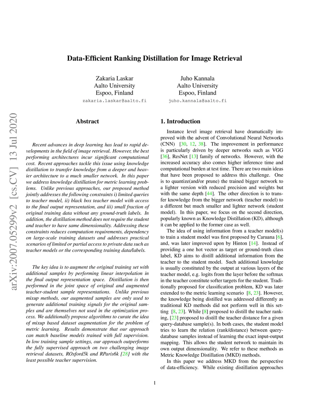Recent advances in deep learning has lead to rapid developments in the field of image retrieval. However, the best performing architectures incur significant computational cost. Recent approaches tackle this issue using knowledge distillation to transfer knowledge from a deeper and heavier architecture to a much smaller network. In this paper we address knowledge distillation for metric learning problems. Unlike previous approaches, our proposed method jointly addresses the following constraints i) limited queries to teacher model, ii) black box teacher model with access to the final output representation, and iii) small fraction of original training data without any ground-truth labels. In addition, the distillation method does not require the student and teacher to have same dimensionality. Addressing these constraints reduces computation requirements, dependency on large-scale training datasets and addresses practical scenarios of limited or partial access to private data such as teacher models or the corresponding training data/labels. The key idea is to augment the original training set with additional samples by performing linear interpolation in the final output representation space. Distillation is then performed in the joint space of original and augmented teacher-student sample representations. Results demonstrate that our approach can match baseline models trained with full supervision. In low training sample settings, our approach outperforms the fully supervised approach on two challenging image retrieval datasets, ROxford5k and RParis6k \cite{Roxf} with the least possible teacher supervision.