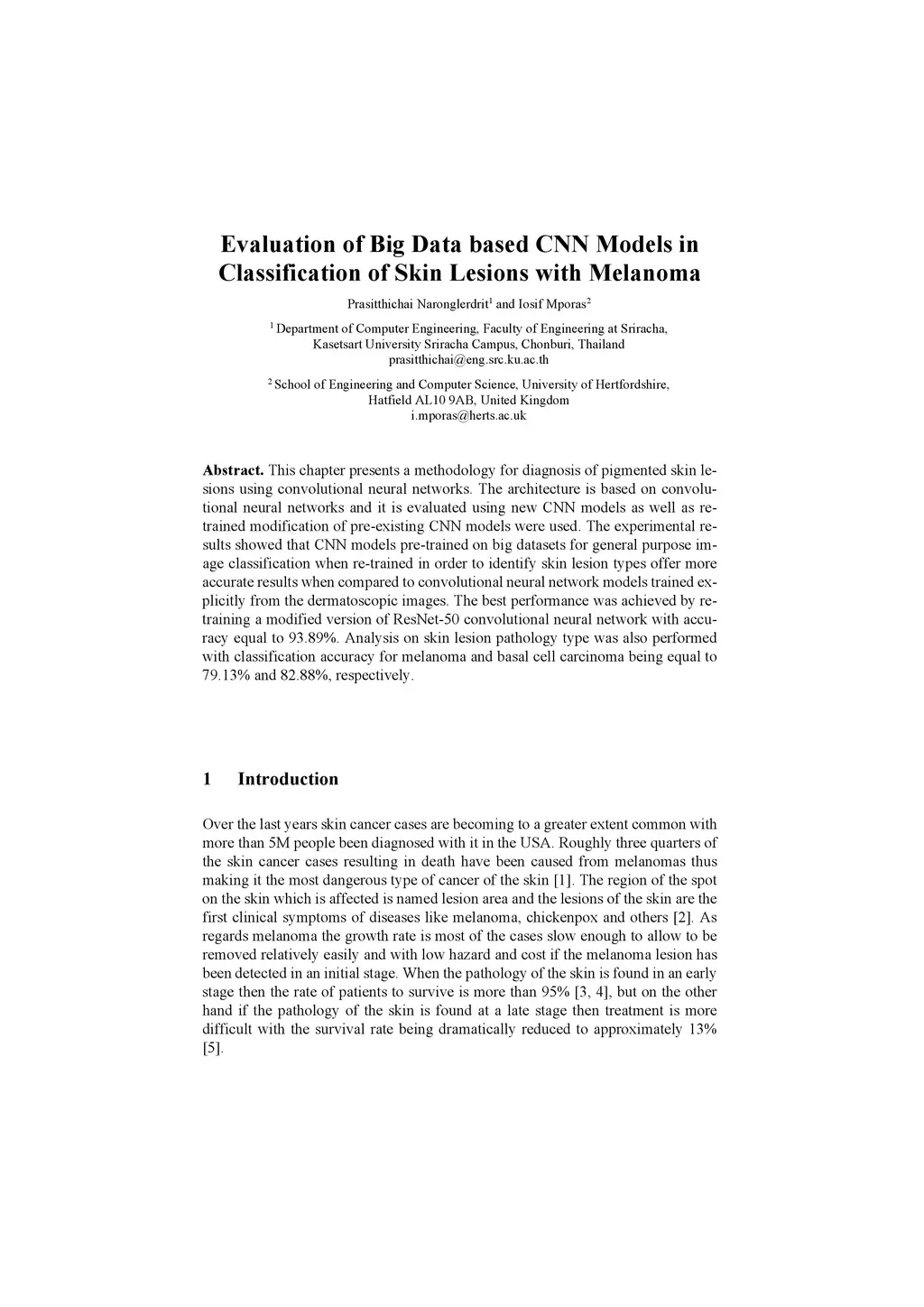 This chapter presents a methodology for diagnosis of pigmented skin lesions using convolutional neural networks. The architecture is based on convolu-tional neural networks and it is evaluated using new CNN models as well as re-trained modification of pre-existing CNN models were used. The experi-mental results showed that CNN models pre-trained on big datasets for gen-eral purpose image classification when re-trained in order to identify skin le-sion types offer more accurate results when compared to convolutional neural network models trained explicitly from the dermatoscopic images. The best performance was achieved by re-training a modified version of ResNet-50 convolutional neural network with accuracy equal to 93.89%. Analysis on skin lesion pathology type was also performed with classification accuracy for melanoma and basal cell carcinoma being equal to 79.13% and 82.88%, respectively.
