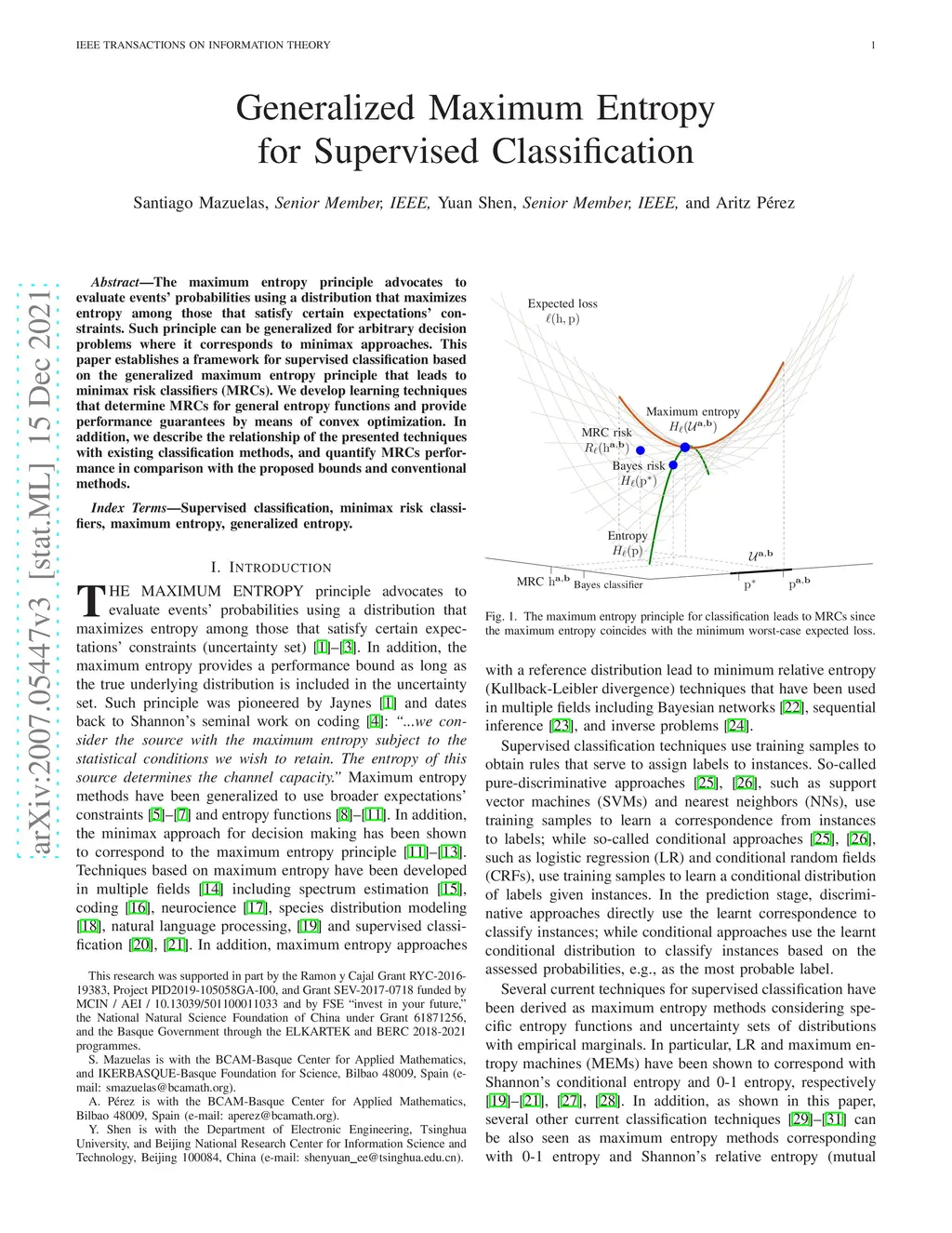 The maximum entropy principle advocates to evaluate events' probabilities using a distribution that maximizes entropy among those that satisfy certain expectations' constraints. Such principle can be generalized for arbitrary decision problems where it corresponds to minimax approaches. This paper establishes a framework for supervised classification based on the generalized maximum entropy principle that leads to minimax risk classifiers (MRCs). We develop learning techniques that determine MRCs for general entropy functions and provide performance guarantees by means of convex optimization. In addition, we describe the relationship of the presented techniques with existing classification methods, and quantify MRCs performance in comparison with the proposed bounds and conventional methods.