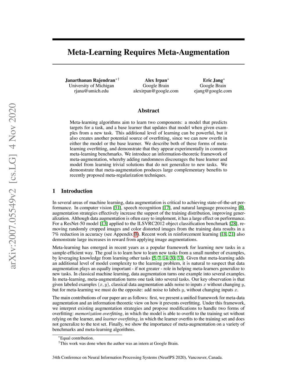 Meta-learning algorithms aim to learn two components: a model that predicts targets for a task, and a base learner that quickly updates that model when given examples from a new task. This additional level of learning can be powerful, but it also creates another potential source for overfitting, since we can now overfit in either the model or the base learner. We describe both of these forms of metalearning overfitting, and demonstrate that they appear experimentally in common meta-learning benchmarks. We then use an information-theoretic framework to discuss meta-augmentation, a way to add randomness that discourages the base learner and model from learning trivial solutions that do not generalize to new tasks. We demonstrate that meta-augmentation produces large complementary benefits to recently proposed meta-regularization techniques.