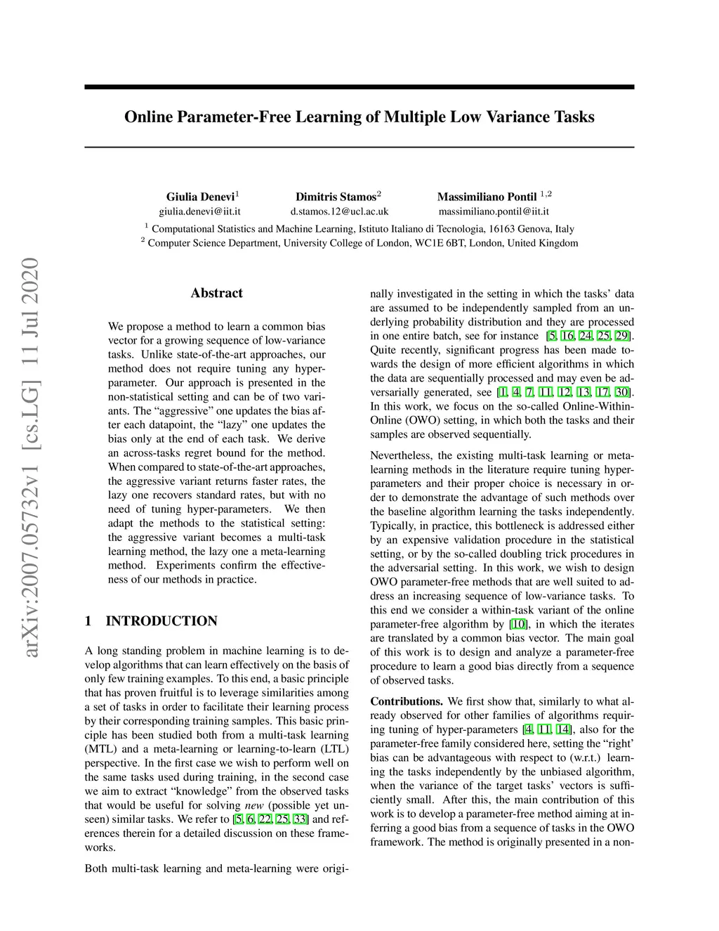 We propose a method to learn a common bias vector for a growing sequence of low-variance tasks. Unlike state-of-the-art approaches, our method does not require tuning any hyper-parameter. Our approach is presented in the non-statistical setting and can be of two variants. The "aggressive" one updates the bias after each datapoint, the "lazy" one updates the bias only at the end of each task. We derive an across-tasks regret bound for the method. When compared to state-of-the-art approaches, the aggressive variant returns faster rates, the lazy one recovers standard rates, but with no need of tuning hyper-parameters. We then adapt the methods to the statistical setting: the aggressive variant becomes a multi-task learning method, the lazy one a meta-learning method. Experiments confirm the effectiveness of our methods in practice.