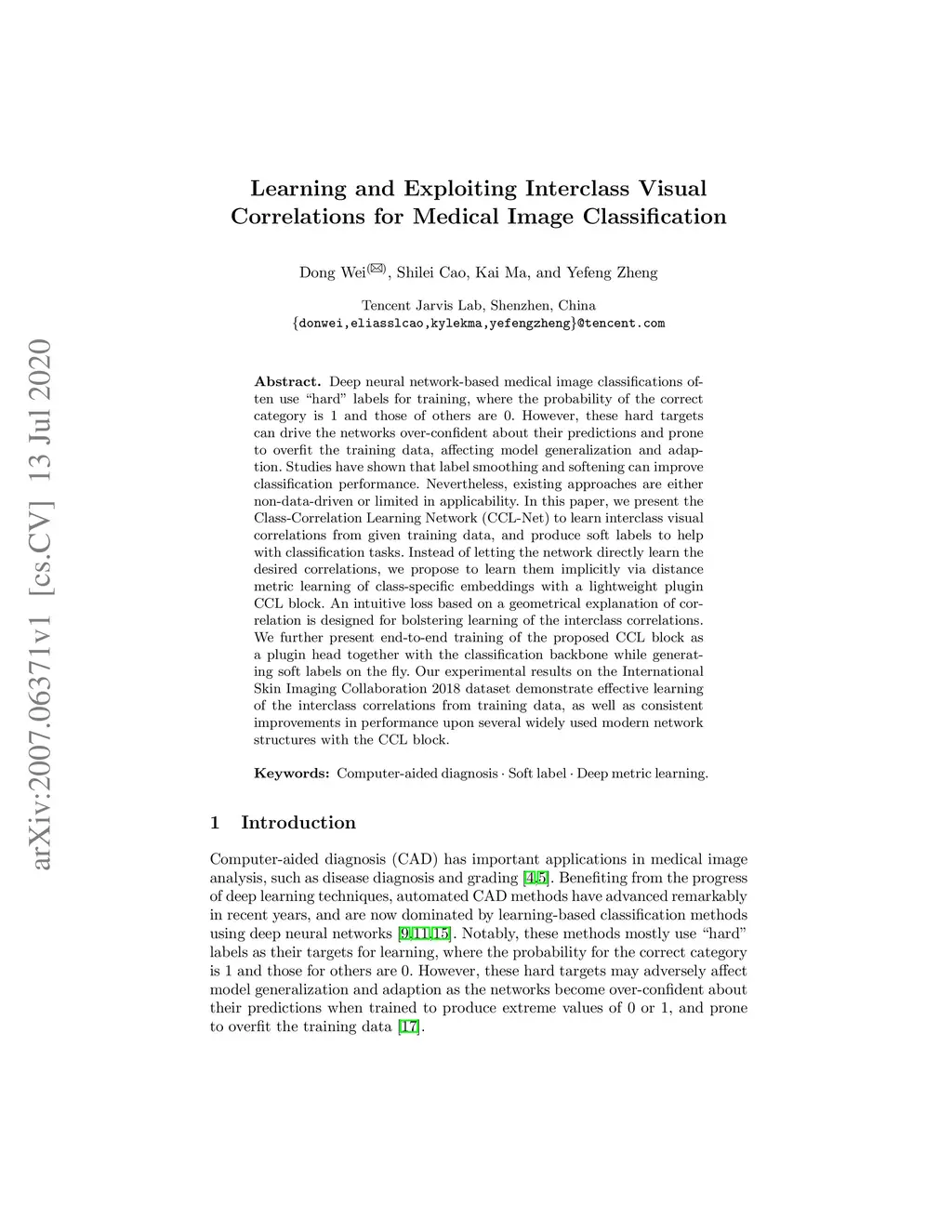 Deep neural network-based medical image classifications often use "hard" labels for training, where the probability of the correct category is 1 and those of others are 0. However, these hard targets can drive the networks over-confident about their predictions and prone to overfit the training data, affecting model generalization and adaption. Studies have shown that label smoothing and softening can improve classification performance. Nevertheless, existing approaches are either non-data-driven or limited in applicability. In this paper, we present the Class-Correlation Learning Network (CCL-Net) to learn interclass visual correlations from given training data, and produce soft labels to help with classification tasks. Instead of letting the network directly learn the desired correlations, we propose to learn them implicitly via distance metric learning of class-specific embeddings with a lightweight plugin CCL block. An intuitive loss based on a geometrical explanation of correlation is designed for bolstering learning of the interclass correlations. We further present end-to-end training of the proposed CCL block as a plugin head together with the classification backbone while generating soft labels on the fly. Our experimental results on the International Skin Imaging Collaboration 2018 dataset demonstrate effective learning of the interclass correlations from training data, as well as consistent improvements in performance upon several widely used modern network structures with the CCL block.