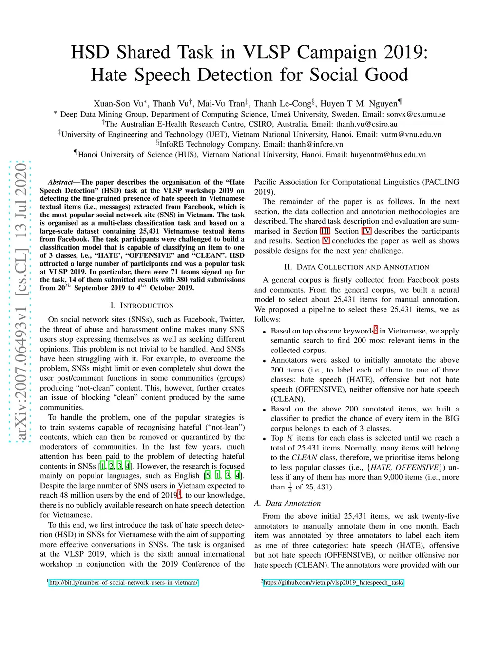 HSD Shared Task in VLSP Campaign 2019:Hate Speech Detection for Social