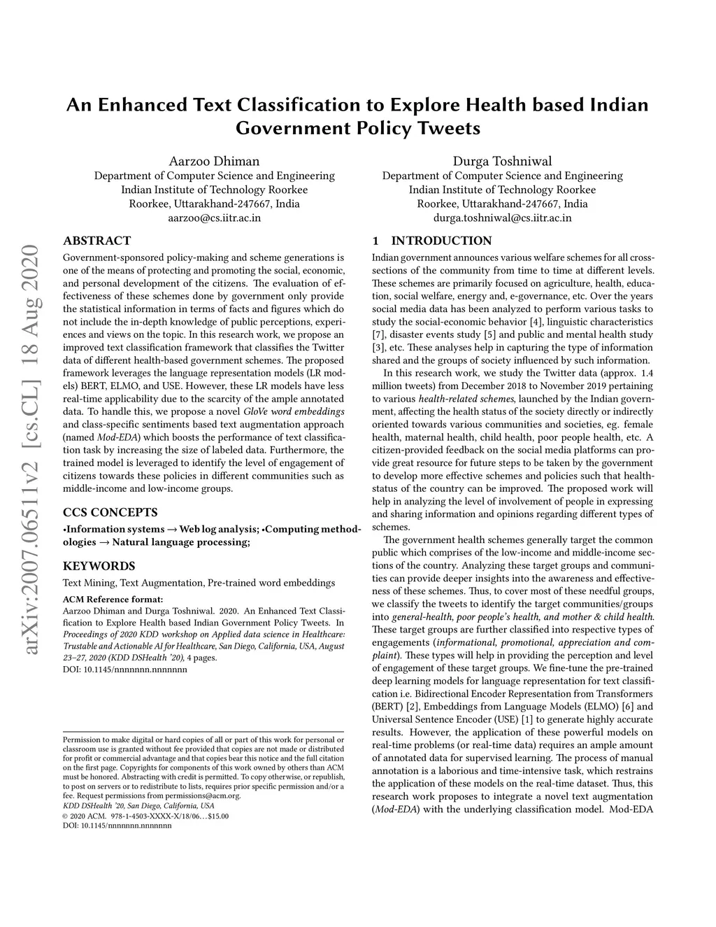 Government-sponsored policy-making and scheme generations is one of the means of protecting and promoting the social, economic, and personal development of the citizens. The evaluation of effectiveness of these schemes done by government only provide the statistical information in terms of facts and figures which do not include the in-depth knowledge of public perceptions, experiences and views on the topic. In this research work, we propose an improved text classification framework that classifies the Twitter data of different health-based government schemes. The proposed framework leverages the language representation models (LR models) BERT, ELMO, and USE. However, these LR models have less real-time applicability due to the scarcity of the ample annotated data. To handle this, we propose a novel GloVe word embeddings and class-specific sentiments based text augmentation approach (named Mod-EDA) which boosts the performance of text classification task by increasing the size of labeled data. Furthermore, the trained model is leveraged to identify the level of engagement of citizens towards these policies in different communities such as middle-income and low-income groups.