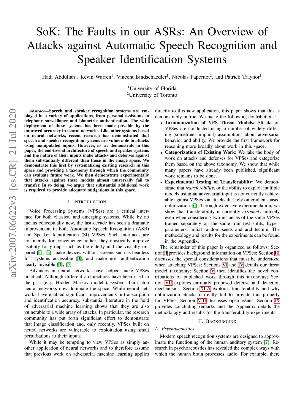 Speech and speaker recognition systems are employed in a variety of applications, from personal assistants to telephony surveillance and biometric authentication. The wide deployment of these systems has been made possible by the improved accuracy in neural networks. Like other systems based on neural networks, recent research has demonstrated that speech and speaker recognition systems are vulnerable to attacks using manipulated inputs. However, as we demonstrate in this paper, the end-to-end architecture of speech and speaker systems and the nature of their inputs make attacks and defenses against them substantially different than those in the image space. We demonstrate this first by systematizing existing research in this space and providing a taxonomy through which the community can evaluate future work. We then demonstrate experimentally that attacks against these models almost universally fail to transfer. In so doing, we argue that substantial additional work is required to provide adequate mitigations in this space.