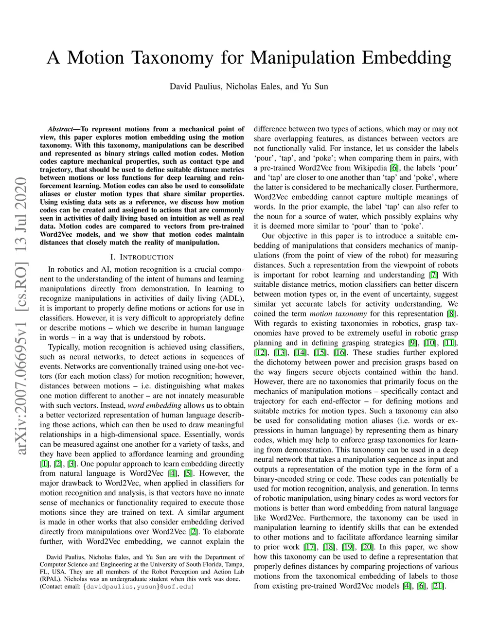 To represent motions from a mechanical point of view, this paper explores motion embedding using the motion taxonomy. With this taxonomy, manipulations can be described and represented as binary strings called motion codes. Motion codes capture mechanical properties, such as contact type and trajectory, that should be used to define suitable distance metrics between motions or loss functions for deep learning and reinforcement learning. Motion codes can also be used to consolidate aliases or cluster motion types that share similar properties. Using existing data sets as a reference, we discuss how motion codes can be created and assigned to actions that are commonly seen in activities of daily living based on intuition as well as real data. Motion codes are compared to vectors from pre-trained Word2Vec models, and we show that motion codes maintain distances that closely match the reality of manipulation.