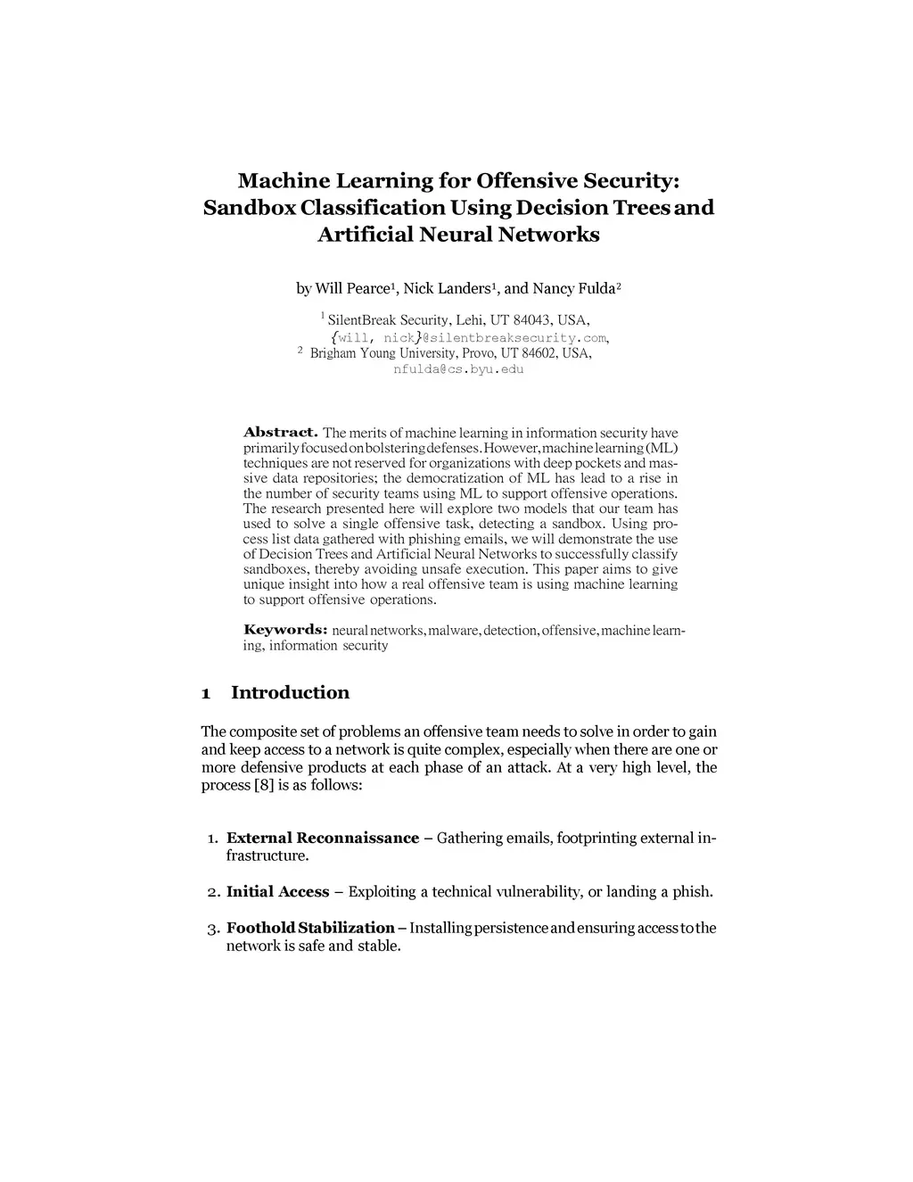 The merits of machine learning in information security have primarily focused on bolstering defenses. However, machine learning (ML) techniques are not reserved for organizations with deep pockets and massive data repositories; the democratization of ML has lead to a rise in the number of security teams using ML to support offensive operations. The research presented here will explore two models that our team has used to solve a single offensive task, detecting a sandbox. Using process list data gathered with phishing emails, we will demonstrate the use of Decision Trees and Artificial Neural Networks to successfully classify sandboxes, thereby avoiding unsafe execution. This paper aims to give unique insight into how a real offensive team is using machine learning to support offensive operations.