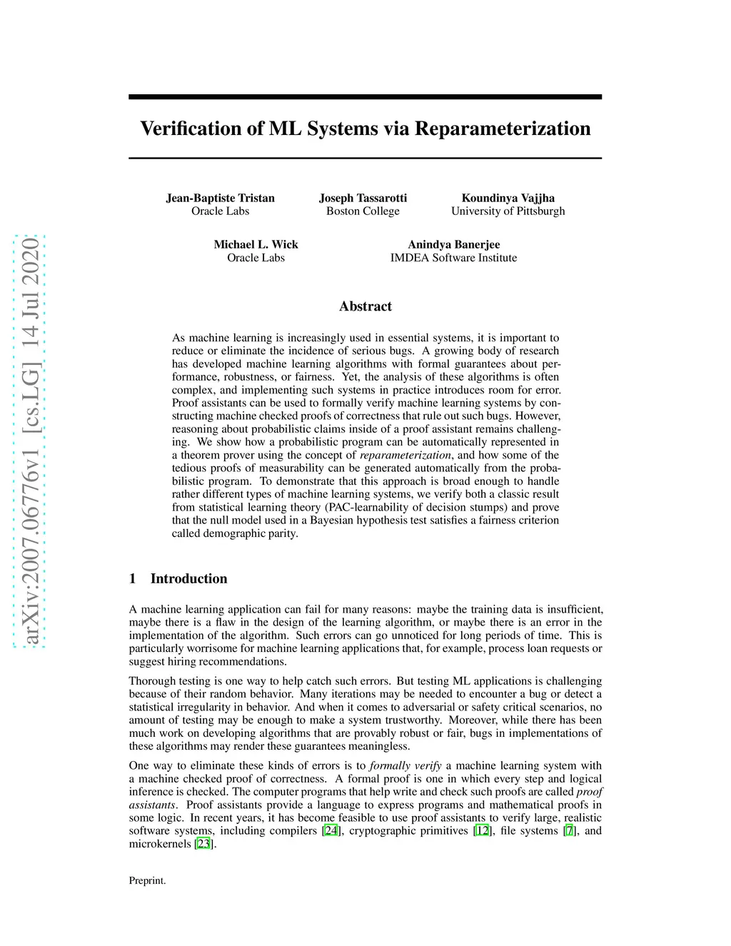 As machine learning is increasingly used in essential systems, it is important to reduce or eliminate the incidence of serious bugs. A growing body of research has developed machine learning algorithms with formal guarantees about performance, robustness, or fairness. Yet, the analysis of these algorithms is often complex, and implementing such systems in practice introduces room for error. Proof assistants can be used to formally verify machine learning systems by constructing machine checked proofs of correctness that rule out such bugs. However, reasoning about probabilistic claims inside of a proof assistant remains challenging. We show how a probabilistic program can be automatically represented in a theorem prover using the concept of \emph{reparameterization}, and how some of the tedious proofs of measurability can be generated automatically from the probabilistic program. To demonstrate that this approach is broad enough to handle rather different types of machine learning systems, we verify both a classic result from statistical learning theory (PAC-learnability of decision stumps) and prove that the null model used in a Bayesian hypothesis test satisfies a fairness criterion called demographic parity.