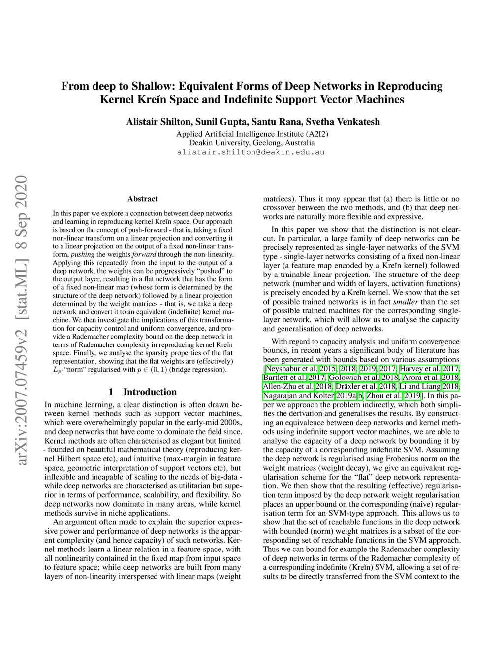 In this paper we explore a connection between deep networks and learning in reproducing kernel Krein space. Our approach is based on the concept of push-forward - that is, taking a fixed non-linear transform on a linear projection and converting it to a linear projection on the output of a fixed non-linear transform, pushing the weights forward through the non-linearity. Applying this repeatedly from the input to the output of a deep network, the weights can be progressively "pushed" to the output layer, resulting in a flat network that has the form of a fixed non-linear map (whose form is determined by the structure of the deep network) followed by a linear projection determined by the weight matrices - that is, we take a deep network and convert it to an equivalent (indefinite) kernel machine. We then investigate the implications of this transformation for capacity control and uniform convergence, and provide a Rademacher complexity bound on the deep network in terms of Rademacher complexity in reproducing kernel Krein space. Finally, we analyse the sparsity properties of the flat representation, showing that the flat weights are (effectively) Lp-"norm" regularised with 0<p<1 (bridge regression).