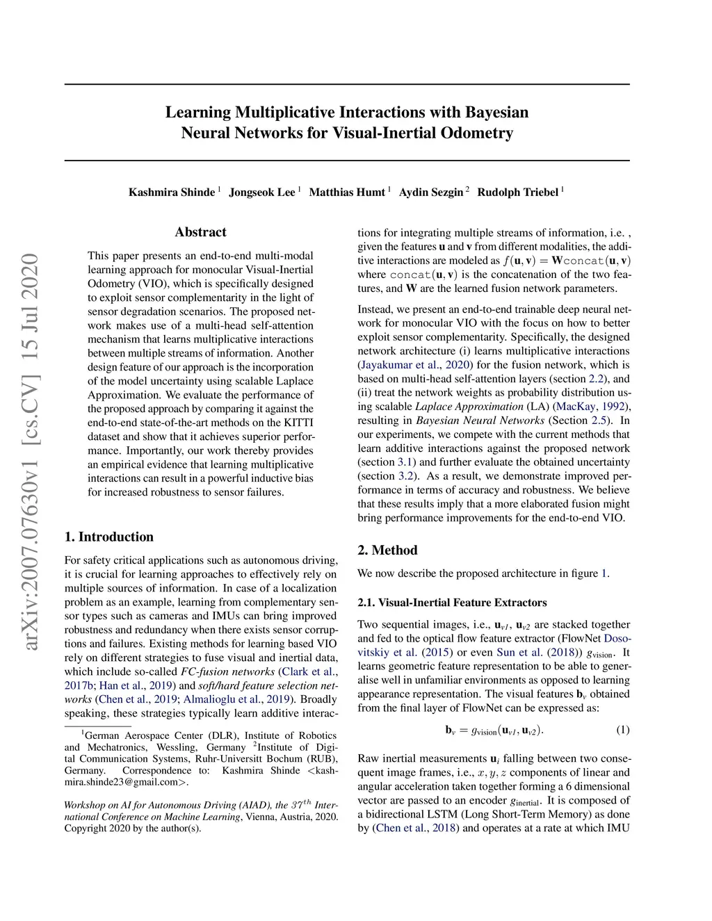 This paper presents an end-to-end multi-modal learning approach for monocular Visual-Inertial Odometry (VIO), which is specifically designed to exploit sensor complementarity in the light of sensor degradation scenarios. The proposed network makes use of a multi-head self-attention mechanism that learns multiplicative interactions between multiple streams of information. Another design feature of our approach is the incorporation of the model uncertainty using scalable Laplace Approximation. We evaluate the performance of the proposed approach by comparing it against the end-to-end state-of-the-art methods on the KITTI dataset and show that it achieves superior performance. Importantly, our work thereby provides an empirical evidence that learning multiplicative interactions can result in a powerful inductive bias for increased robustness to sensor failures.