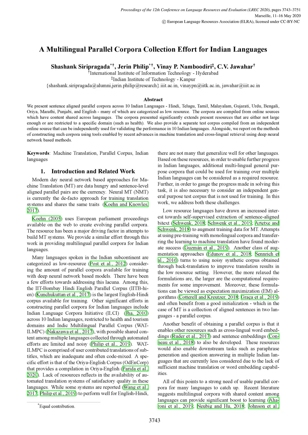 We present sentence aligned parallel corpora across 10 Indian Languages - Hindi, Telugu, Tamil, Malayalam, Gujarati, Urdu, Bengali, Oriya, Marathi, Punjabi, and English - many of which are categorized as low resource. The corpora are compiled from online sources which have content shared across languages. The corpora presented significantly extends present resources that are either not large enough or are restricted to a specific domain (such as health). We also provide a separate test corpus compiled from an independent online source that can be independently used for validating the performance in 10 Indian languages. Alongside, we report on the methods of constructing such corpora using tools enabled by recent advances in machine translation and cross-lingual retrieval using deep neural network based methods.