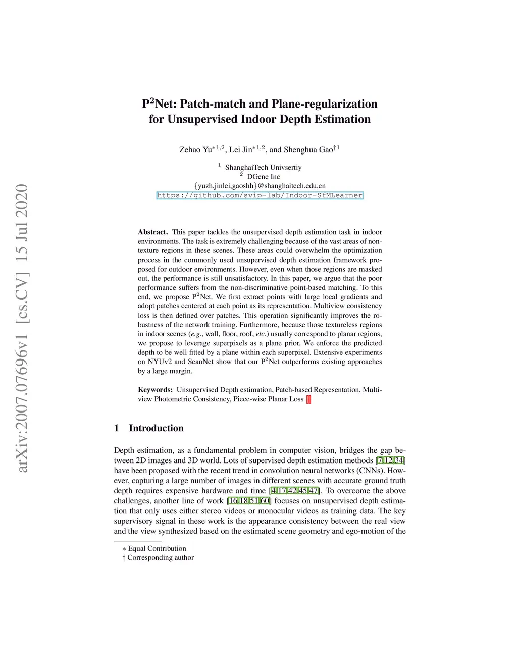 PNet: Patch-match and Plane-regularization for Unsupervised Indoor