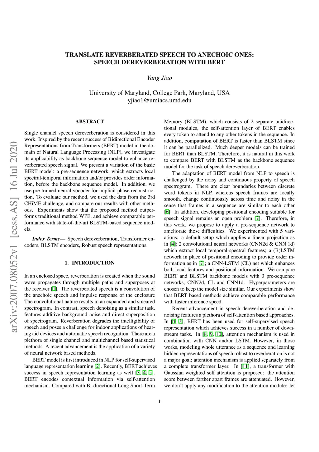 Single channel speech dereverberation is considered in this work. Inspired by the recent success of Bidirectional Encoder Representations from Transformers (BERT) model in the domain of Natural Language Processing (NLP), we investigate its applicability as backbone sequence model to enhance reverberated speech signal. We present a variation of the basic BERT model: a pre-sequence network, which extracts local spectral-temporal information and/or provides order information, before the backbone sequence model. In addition, we use pre-trained neural vocoder for implicit phase reconstruction. To evaluate our method, we used the data from the 3rd CHiME challenge, and compare our results with other methods. Experiments show that the proposed method outperforms traditional method WPE, and achieve comparable performance with state-of-the-art BLSTM-based sequence models.