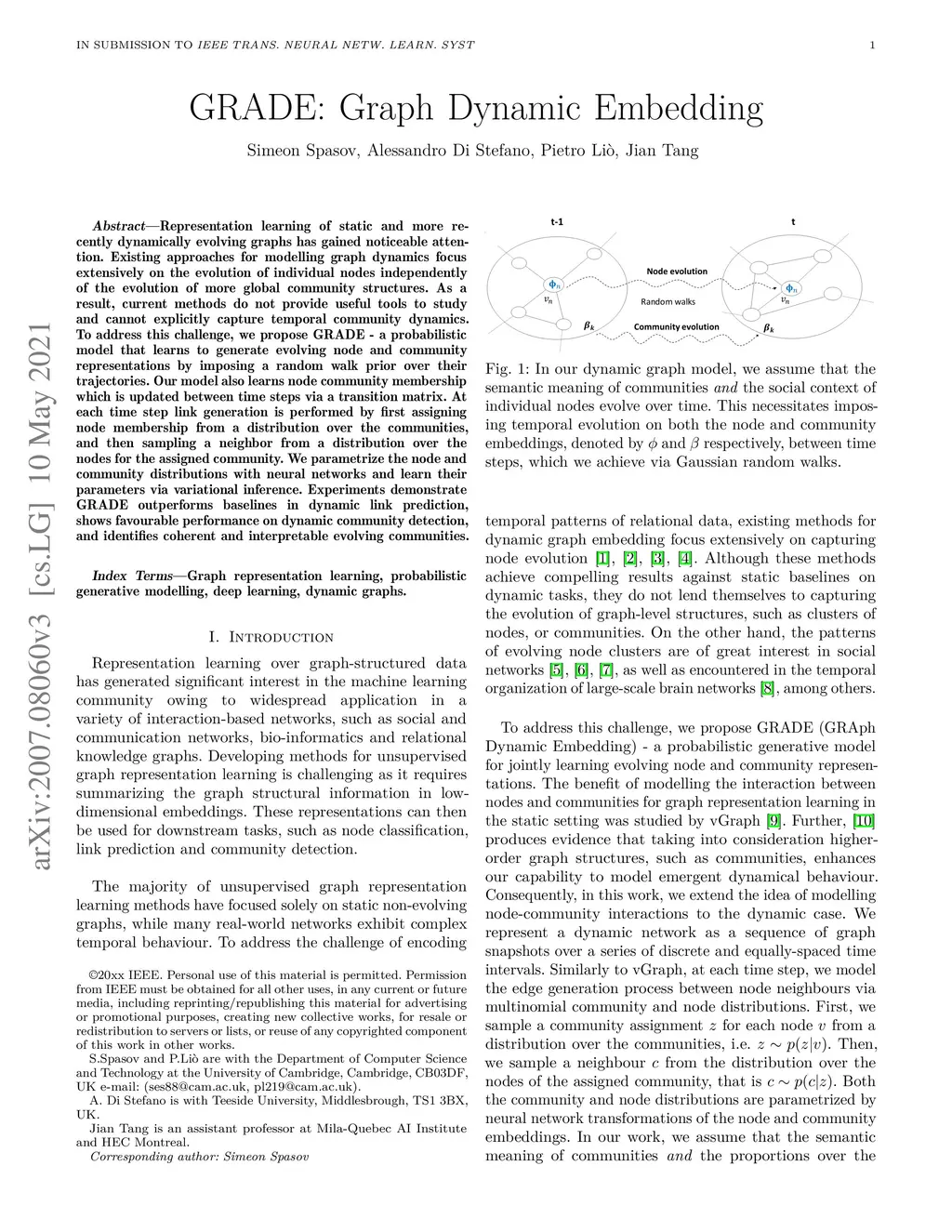 Representation learning of static and more recently dynamically evolving graphs has gained noticeable attention. Existing approaches for modelling graph dynamics focus extensively on the evolution of individual nodes independently of the evolution of mesoscale community structures. As a result, current methods do not provide useful tools to study and cannot explicitly capture temporal community dynamics. To address this challenge, we propose GRADE - a probabilistic model that learns to generate evolving node and community representations by imposing a random walk prior over their trajectories. Our model also learns node community membership which is updated between time steps via a transition matrix. At each time step link generation is performed by first assigning node membership from a distribution over the communities, and then sampling a neighbor from a distribution over the nodes for the assigned community. We parametrize the node and community distributions with neural networks and learn their parameters via variational inference. Experiments demonstrate GRADE outperforms baselines in dynamic link prediction, shows favourable performance on dynamic community detection, and identifies coherent and interpretable evolving communities.