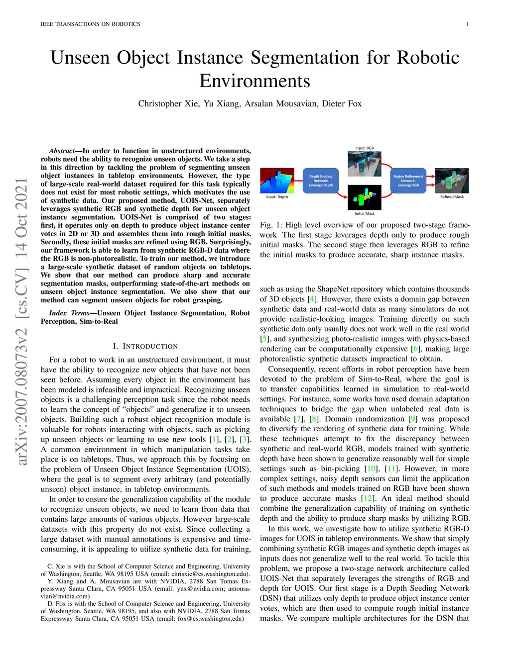 Unseen Object Instance Segmentation for Robotic Environments