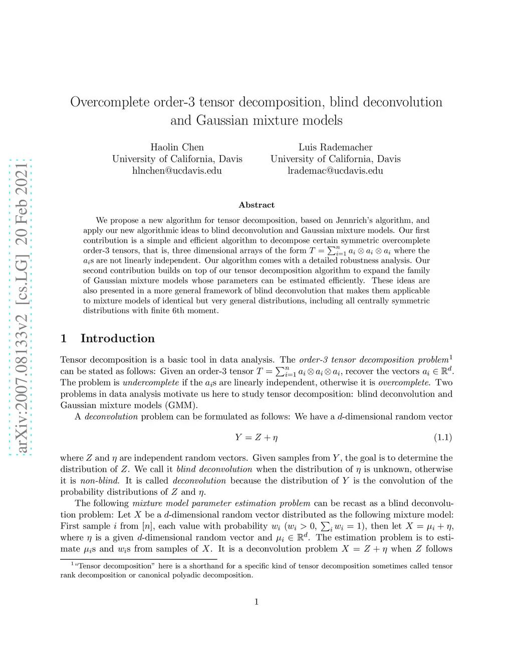 We propose a new algorithm for tensor decomposition, based on Jennrich's algorithm, and apply our new algorithmic ideas to blind deconvolution and Gaussian mixture models. Our first contribution is a simple and efficient algorithm to decompose certain symmetric overcomplete order-3 tensors, that is, three dimensional arrays of the form where the s are not linearly independent.Our algorithm comes with a detailed robustness analysis. Our second contribution builds on top of our tensor decomposition algorithm to expand the family of Gaussian mixture models whose parameters can be estimated efficiently. These ideas are also presented in a more general framework of blind deconvolution that makes them applicable to mixture models of identical but very general distributions, including all centrally symmetric distributions with finite 6th moment.