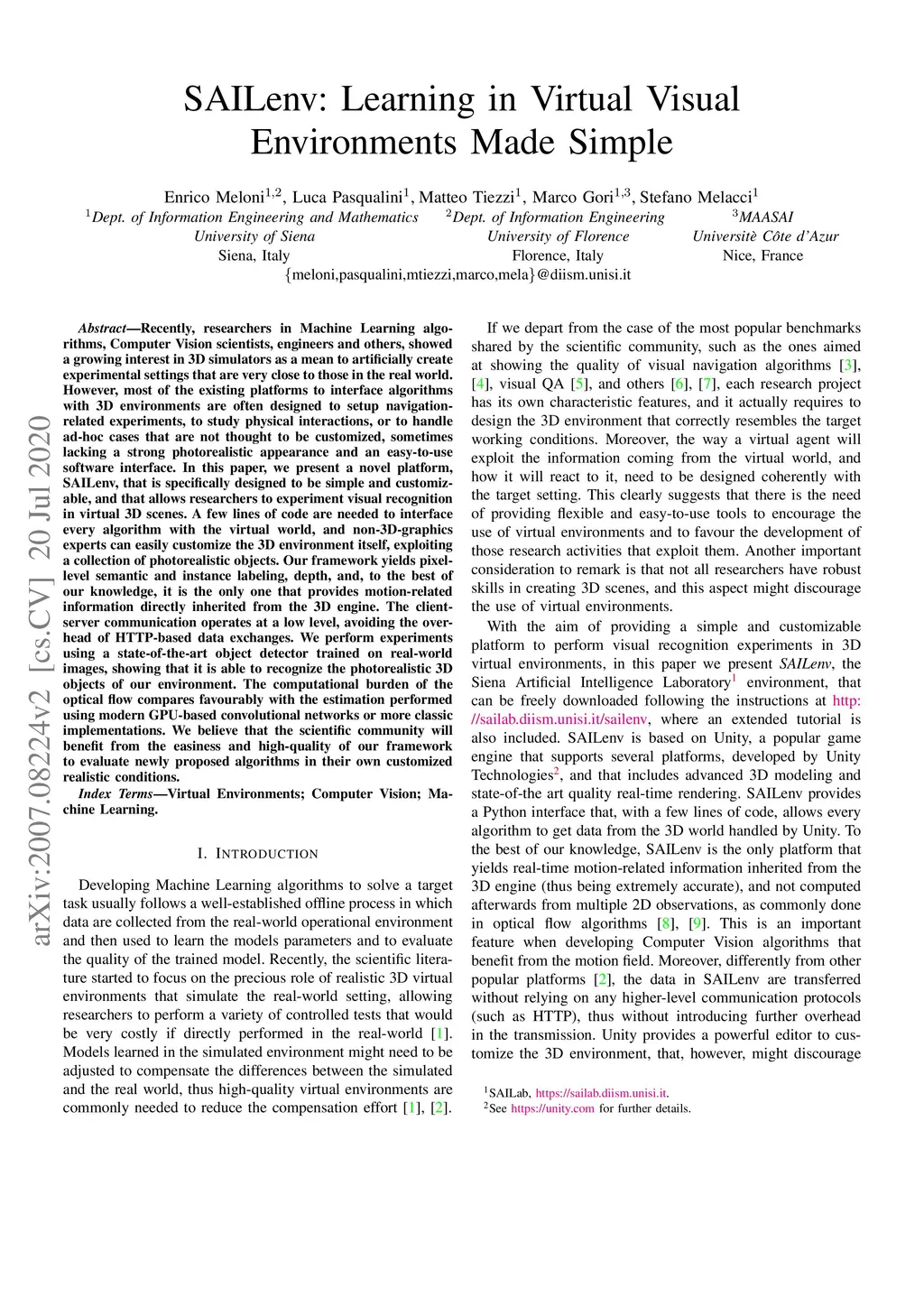 Recently, researchers in Machine Learning algorithms, Computer Vision scientists, engineers and others, showed a growing interest in 3D simulators as a mean to artificially create experimental settings that are very close to those in the real world. However, most of the existing platforms to interface algorithms with 3D environments are often designed to setup navigation-related experiments, to study physical interactions, or to handle ad-hoc cases that are not thought to be customized, sometimes lacking a strong photorealistic appearance and an easy-to-use software interface. In this paper, we present a novel platform, SAILenv, that is specifically designed to be simple and customizable, and that allows researchers to experiment visual recognition in virtual 3D scenes. A few lines of code are needed to interface every algorithm with the virtual world, and non-3D-graphics experts can easily customize the 3D environment itself, exploiting a collection of photorealistic objects. Our framework yields pixel-level semantic and instance labeling, depth, and, to the best of our knowledge, it is the only one that provides motion-related information directly inherited from the 3D engine. The client-server communication operates at a low level, avoiding the overhead of HTTP-based data exchanges. We perform experiments using a state-of-the-art object detector trained on real-world images, showing that it is able to recognize the photorealistic 3D objects of our environment. The computational burden of the optical flow compares favourably with the estimation performed using modern GPU-based convolutional networks or more classic implementations. We believe that the scientific community will benefit from the easiness and high-quality of our framework to evaluate newly proposed algorithms in their own customized realistic conditions.