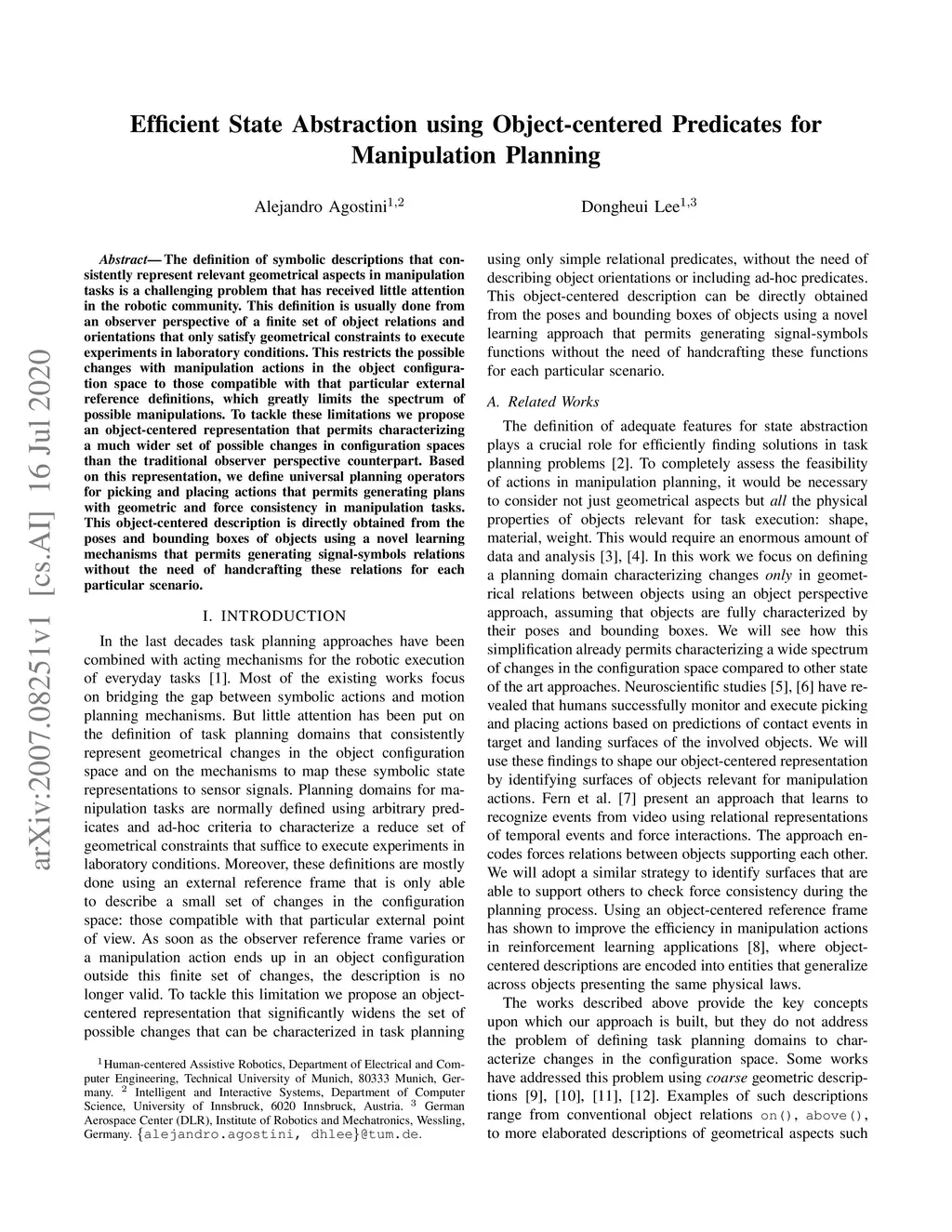 The definition of symbolic descriptions that consistently represent relevant geometrical aspects in manipulation tasks is a challenging problem that has received little attention in the robotic community. This definition is usually done from an observer perspective of a finite set of object relations and orientations that only satisfy geometrical constraints to execute experiments in laboratory conditions. This restricts the possible changes with manipulation actions in the object configuration space to those compatible with that particular external reference definitions, which greatly limits the spectrum of possible manipulations. To tackle these limitations we propose an object-centered representation that permits characterizing a much wider set of possible changes in configuration spaces than the traditional observer perspective counterpart. Based on this representation, we define universal planning operators for picking and placing actions that permits generating plans with geometric and force consistency in manipulation tasks. This object-centered description is directly obtained from the poses and bounding boxes of objects using a novel learning mechanisms that permits generating signal-symbols relations without the need of handcrafting these relations for each particular scenario.