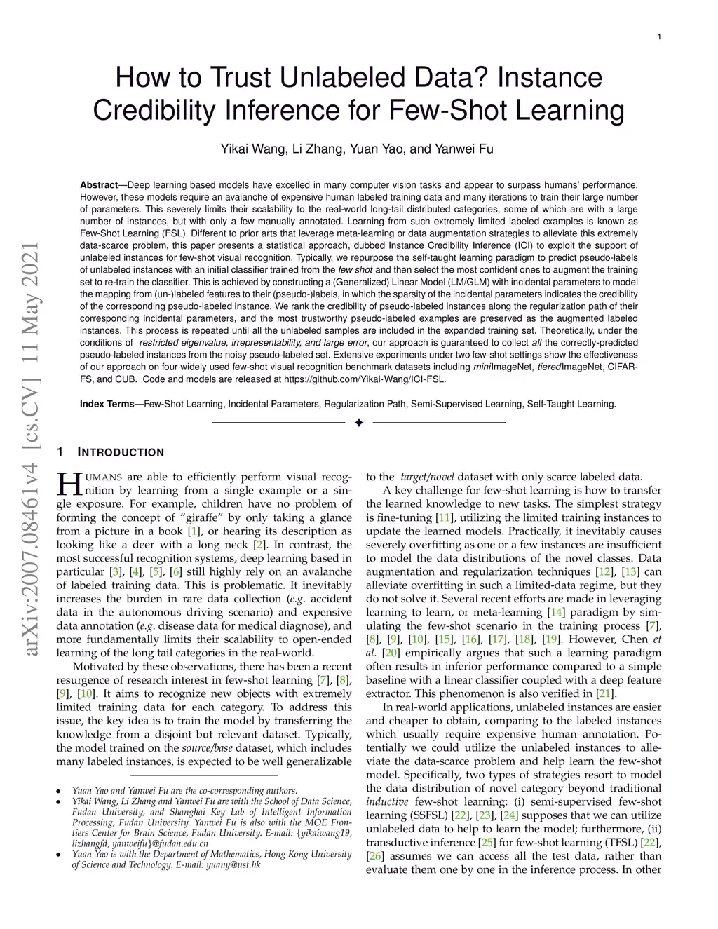 Deep learning based models have excelled in many computer vision tasks and appear to surpass humans' performance. However, these models require an avalanche of expensive human labeled training data and many iterations to train their large number of parameters. This severely limits their scalability to the real-world long-tail distributed categories, some of which are with a large number of instances, but with only a few manually annotated. Learning from such extremely limited labeled examples is known as Few-shot learning (FSL). Different to prior arts that leverage meta-learning or data augmentation strategies to alleviate this extremely data-scarce problem, this paper presents a statistical approach, dubbed Instance Credibility Inference (ICI) to exploit the support of unlabeled instances for few-shot visual recognition. Typically, we repurpose the self-taught learning paradigm to predict pseudo-labels of unlabeled instances with an initial classifier trained from the few shot and then select the most confident ones to augment the training set to re-train the classifier. This is achieved by constructing a (Generalized) Linear Model (LM/GLM) with incidental parameters to model the mapping from (un-)labeled features to their (pseudo-)labels, in which the sparsity of the incidental parameters indicates the credibility of the corresponding pseudo-labeled instance. We rank the credibility of pseudo-labeled instances along the regularization path of their corresponding incidental parameters, and the most trustworthy pseudo-labeled examples are preserved as the augmented labeled instances. Theoretically, under mild conditions of restricted eigenvalue, irrepresentability, and large error, our approach is guaranteed to collect all the correctly-predicted instances from the noisy pseudo-labeled set.