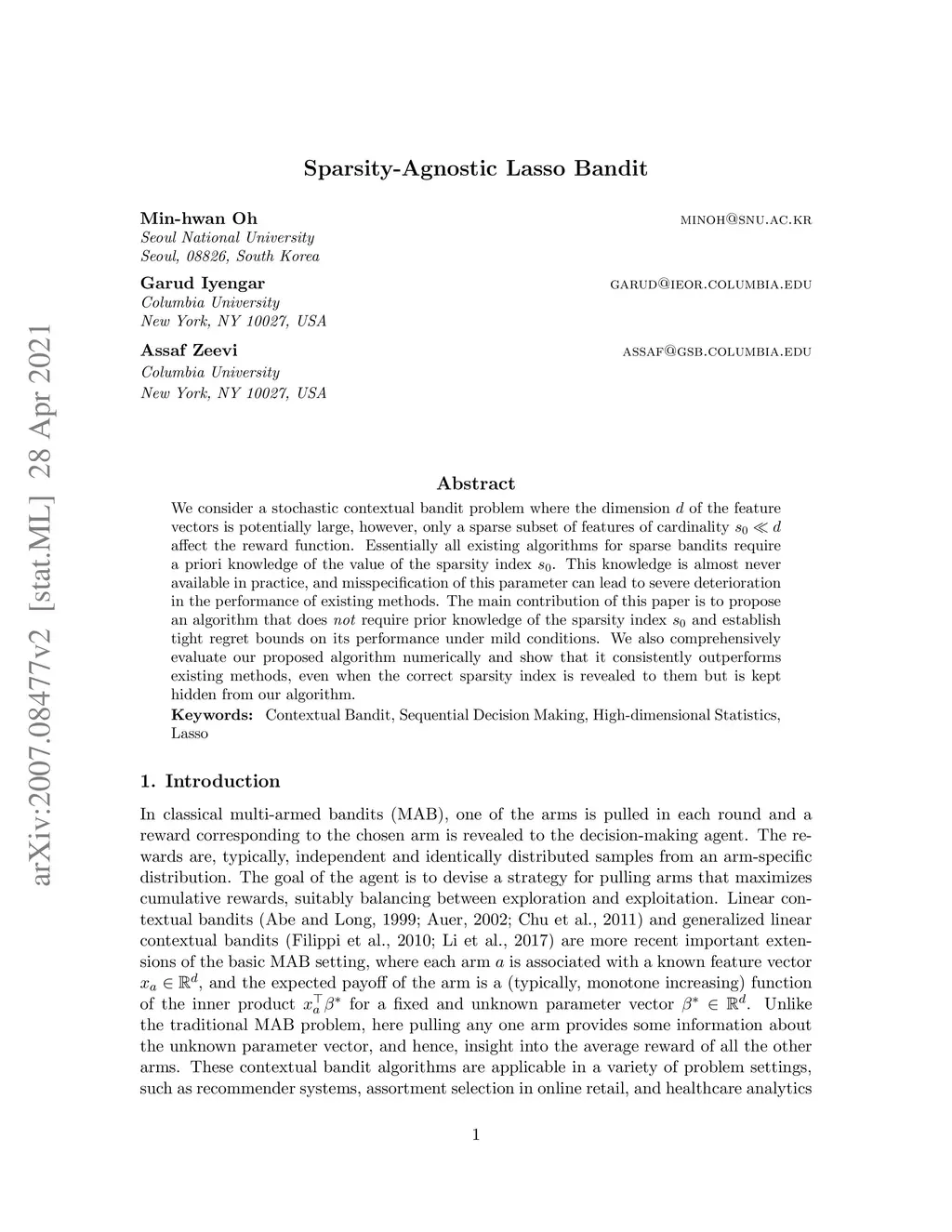We consider a stochastic contextual bandit problem where the dimension of the feature vectors is potentially large, however, only a sparse subset of features of cardinality affect the reward function. Essentially all existing algorithms for sparse bandits require a priori knowledge of the value of the sparsity index . This knowledge is almost never available in practice, and misspecification of this parameter can lead to severe deterioration in the performance of existing methods. The main contribution of this paper is to propose an algorithm that does not require prior knowledge of the sparsity index and establish tight regret bounds on its performance under mild conditions. We also comprehensively evaluate our proposed algorithm numerically and show that it consistently outperforms existing methods, even when the correct sparsity index is revealed to them but is kept hidden from our algorithm.