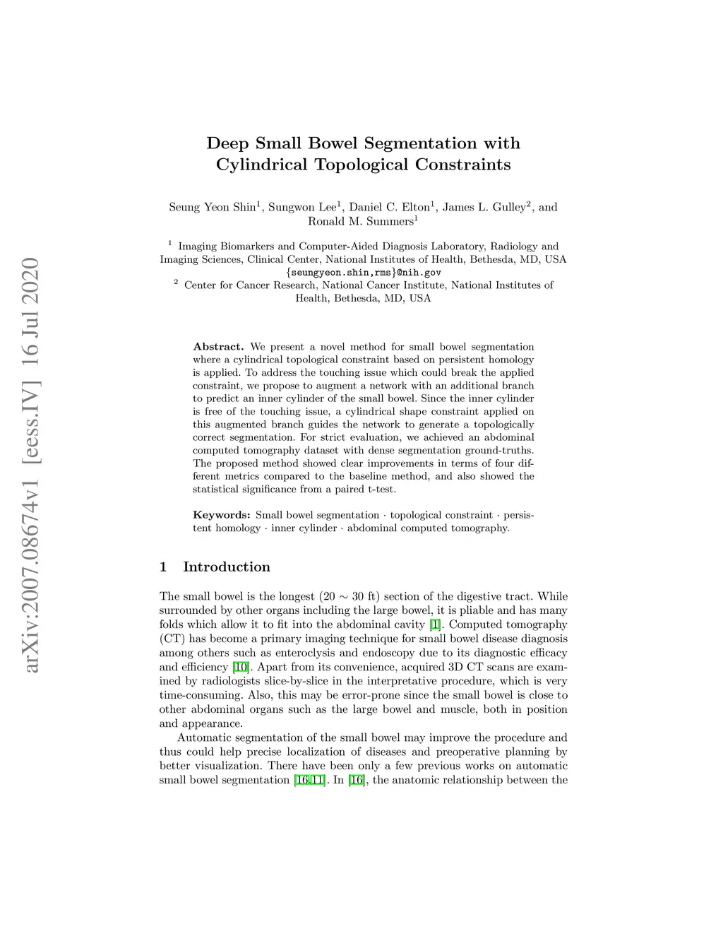 We present a novel method for small bowel segmentation where a cylindrical topological constraint based on persistent homology is applied. To address the touching issue which could break the applied constraint, we propose to augment a network with an additional branch to predict an inner cylinder of the small bowel. Since the inner cylinder is free of the touching issue, a cylindrical shape constraint applied on this augmented branch guides the network to generate a topologically correct segmentation. For strict evaluation, we achieved an abdominal computed tomography dataset with dense segmentation ground-truths. The proposed method showed clear improvements in terms of four different metrics compared to the baseline method, and also showed the statistical significance from a paired t-test.