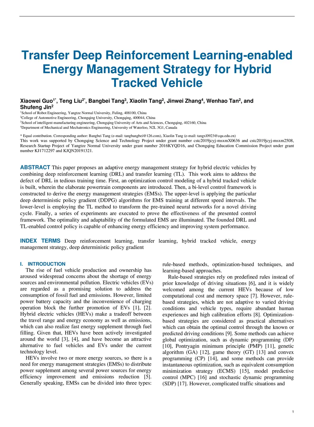 This paper proposes an adaptive energy management strategy for hybrid electric vehicles by combining deep reinforcement learning (DRL) and transfer learning (TL). This work aims to address the defect of DRL in tedious training time. First, an optimization control modeling of a hybrid tracked vehicle is built, wherein the elaborate powertrain components are introduced. Then, a bi-level control framework is constructed to derive the energy management strategies (EMSs). The upper-level is applying the particular deep deterministic policy gradient (DDPG) algorithms for EMS training at different speed intervals. The lower-level is employing the TL method to transform the pre-trained neural networks for a novel driving cycle. Finally, a series of experiments are executed to prove the effectiveness of the presented control framework. The optimality and adaptability of the formulated EMS are illuminated. The founded DRL and TL-enabled control policy is capable of enhancing energy efficiency and improving system performance.