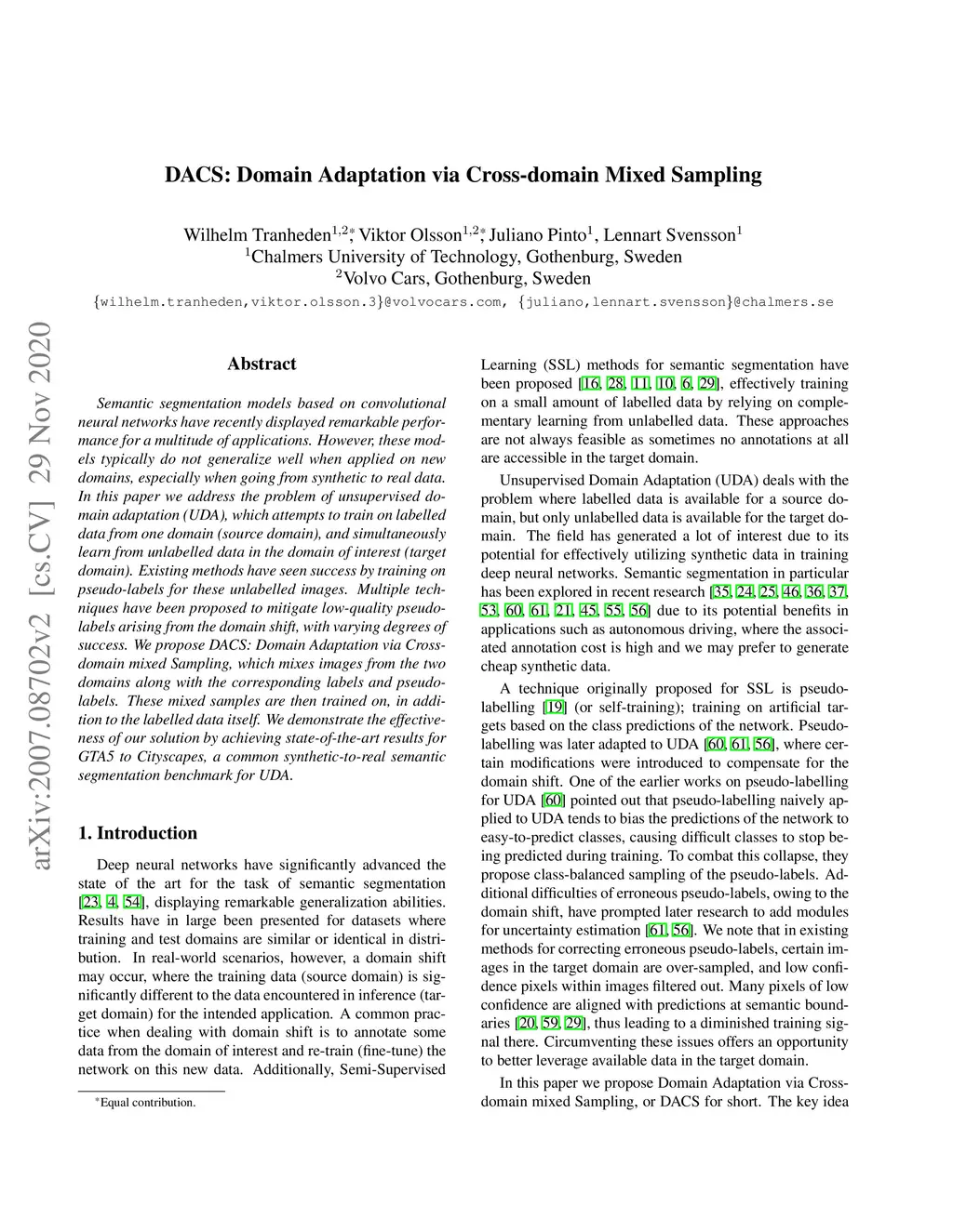 DACS: Domain Adaptation via Cross-domain Mixed Sampling