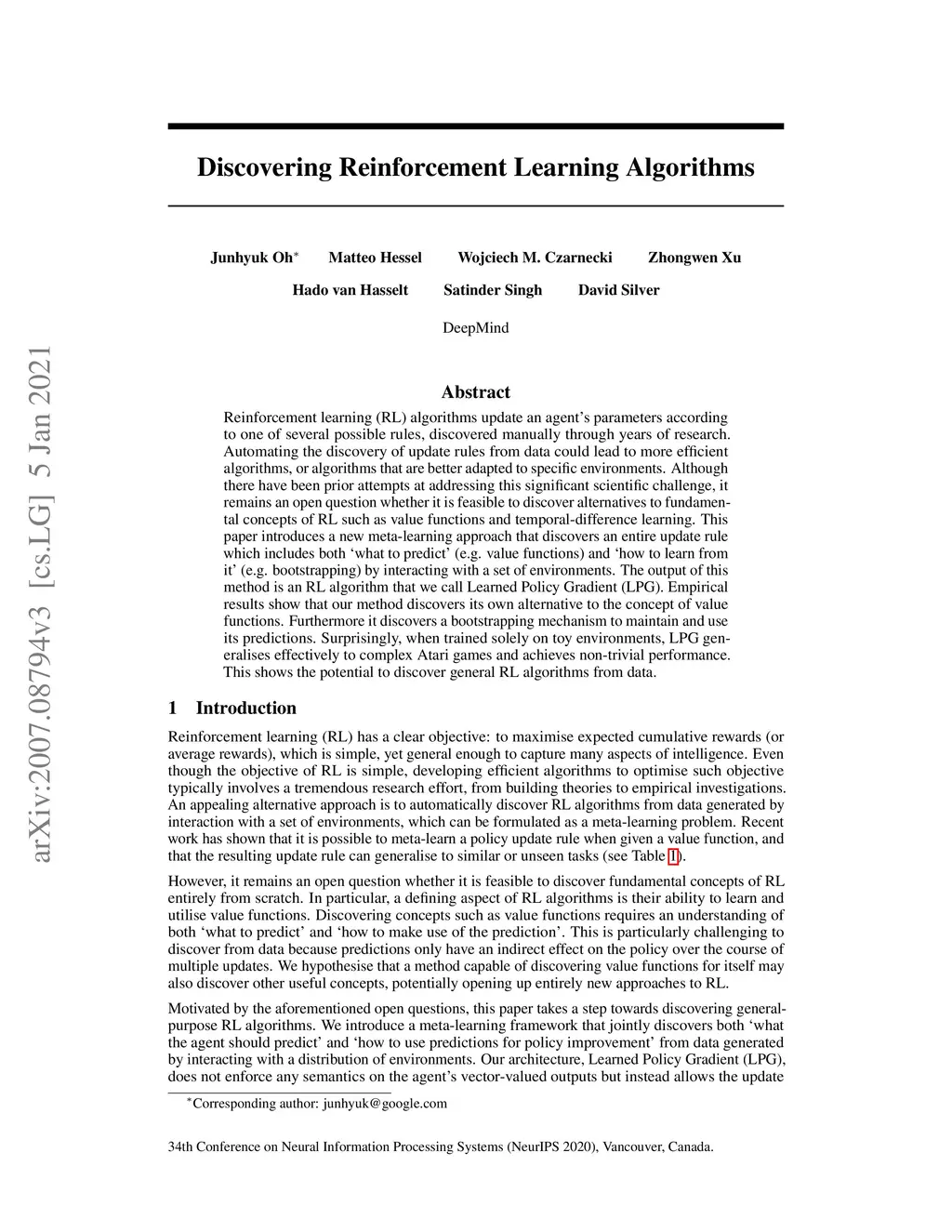 Reinforcement learning (RL) algorithms update an agent's parameters according to one of several possible rules, discovered manually through years of research. Automating the discovery of update rules from data could lead to more efficient algorithms, or algorithms that are better adapted to specific environments. Although there have been prior attempts at addressing this significant scientific challenge, it remains an open question whether it is feasible to discover alternatives to fundamental concepts of RL such as value functions and temporal-difference learning. This paper introduces a new meta-learning approach that discovers an entire update rule which includes both 'what to predict' (e.g. value functions) and 'how to learn from it' (e.g. bootstrapping) by interacting with a set of environments. The output of this method is an RL algorithm that we call Learned Policy Gradient (LPG). Empirical results show that our method discovers its own alternative to the concept of value functions. Furthermore it discovers a bootstrapping mechanism to maintain and use its predictions. Surprisingly, when trained solely on toy environments, LPG generalises effectively to complex Atari games and achieves non-trivial performance. This shows the potential to discover general RL algorithms from data.
