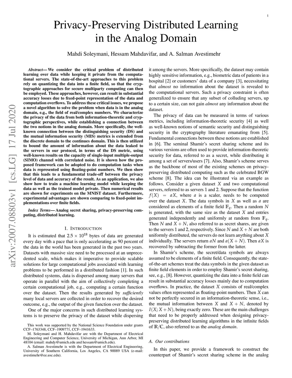 We consider the critical problem of distributed learning over data while keeping it private from the computational servers. The state-of-the-art approaches to this problem rely on quantizing the data into a finite field, so that the cryptographic approaches for secure multiparty computing can then be employed. These approaches, however, can result in substantial accuracy losses due to fixed-point representation of the data and computation overflows. To address these critical issues, we propose a novel algorithm to solve the problem when data is in the analog domain, e.g., the field of real/complex numbers. We characterize the privacy of the data from both information-theoretic and cryptographic perspectives, while establishing a connection between the two notions in the analog domain. More specifically, the well-known connection between the distinguishing security (DS) and the mutual information security (MIS) metrics is extended from the discrete domain to the continues domain. This is then utilized to bound the amount of information about the data leaked to the servers in our protocol, in terms of the DS metric, using well-known results on the capacity of single-input multiple-output (SIMO) channel with correlated noise. It is shown how the proposed framework can be adopted to do computation tasks when data is represented using floating-point numbers. We then show that this leads to a fundamental trade-off between the privacy level of data and accuracy of the result. As an application, we also show how to train a machine learning model while keeping the data as well as the trained model private. Then numerical results are shown for experiments on the MNIST dataset. Furthermore, experimental advantages are shown comparing to fixed-point implementations over finite fields.