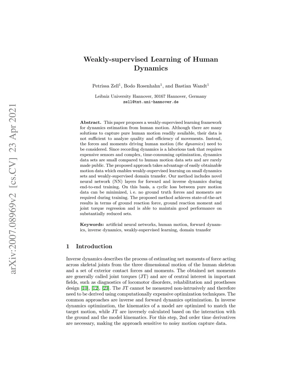This paper proposes a weakly-supervised learning framework for dynamics estimation from human motion. Although there are many solutions to capture pure human motion readily available, their data is not sufficient to analyze quality and efficiency of movements. Instead, the forces and moments driving human motion (the dynamics) need to be considered. Since recording dynamics is a laborious task that requires expensive sensors and complex, time-consuming optimization, dynamics data sets are small compared to human motion data sets and are rarely made public. The proposed approach takes advantage of easily obtainable motion data which enables weakly-supervised learning on small dynamics sets and weakly-supervised domain transfer. Our method includes novel neural network (NN) layers for forward and inverse dynamics during end-to-end training. On this basis, a cyclic loss between pure motion data can be minimized, i.e. no ground truth forces and moments are required during training. The proposed method achieves state-of-the-art results in terms of ground reaction force, ground reaction moment and joint torque regression and is able to maintain good performance on substantially reduced sets.