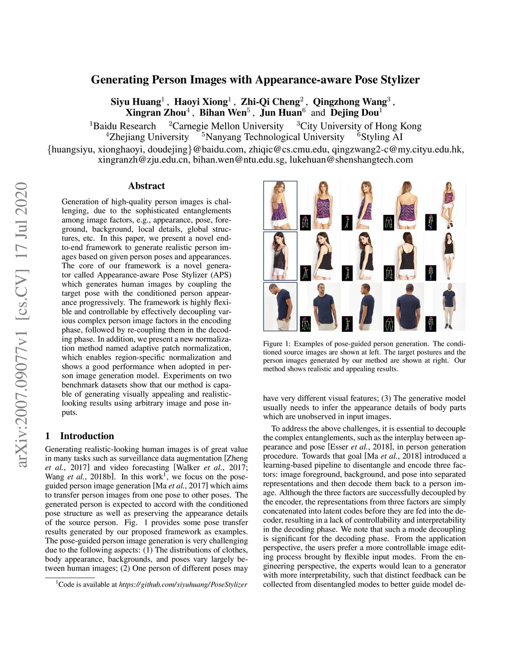 Generation of high-quality person images is challenging, due to the sophisticated entanglements among image factors, e.g., appearance, pose, foreground, background, local details, global structures, etc. In this paper, we present a novel end-to-end framework to generate realistic person images based on given person poses and appearances. The core of our framework is a novel generator called Appearance-aware Pose Stylizer (APS) which generates human images by coupling the target pose with the conditioned person appearance progressively. The framework is highly flexible and controllable by effectively decoupling various complex person image factors in the encoding phase, followed by re-coupling them in the decoding phase. In addition, we present a new normalization method named adaptive patch normalization, which enables region-specific normalization and shows a good performance when adopted in person image generation model. Experiments on two benchmark datasets show that our method is capable of generating visually appealing and realistic-looking results using arbitrary image and pose inputs.