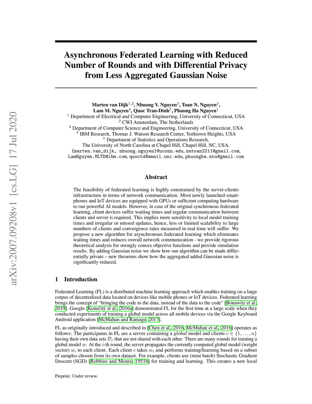 The feasibility of federated learning is highly constrained by the server-clients infrastructure in terms of network communication. Most newly launched smartphones and IoT devices are equipped with GPUs or sufficient computing hardware to run powerful AI models. However, in case of the original synchronous federated learning, client devices suffer waiting times and regular communication between clients and server is required. This implies more sensitivity to local model training times and irregular or missed updates, hence, less or limited scalability to large numbers of clients and convergence rates measured in real time will suffer. We propose a new algorithm for asynchronous federated learning which eliminates waiting times and reduces overall network communication - we provide rigorous theoretical analysis for strongly convex objective functions and provide simulation results. By adding Gaussian noise we show how our algorithm can be made differentially private -- new theorems show how the aggregated added Gaussian noise is significantly reduced.