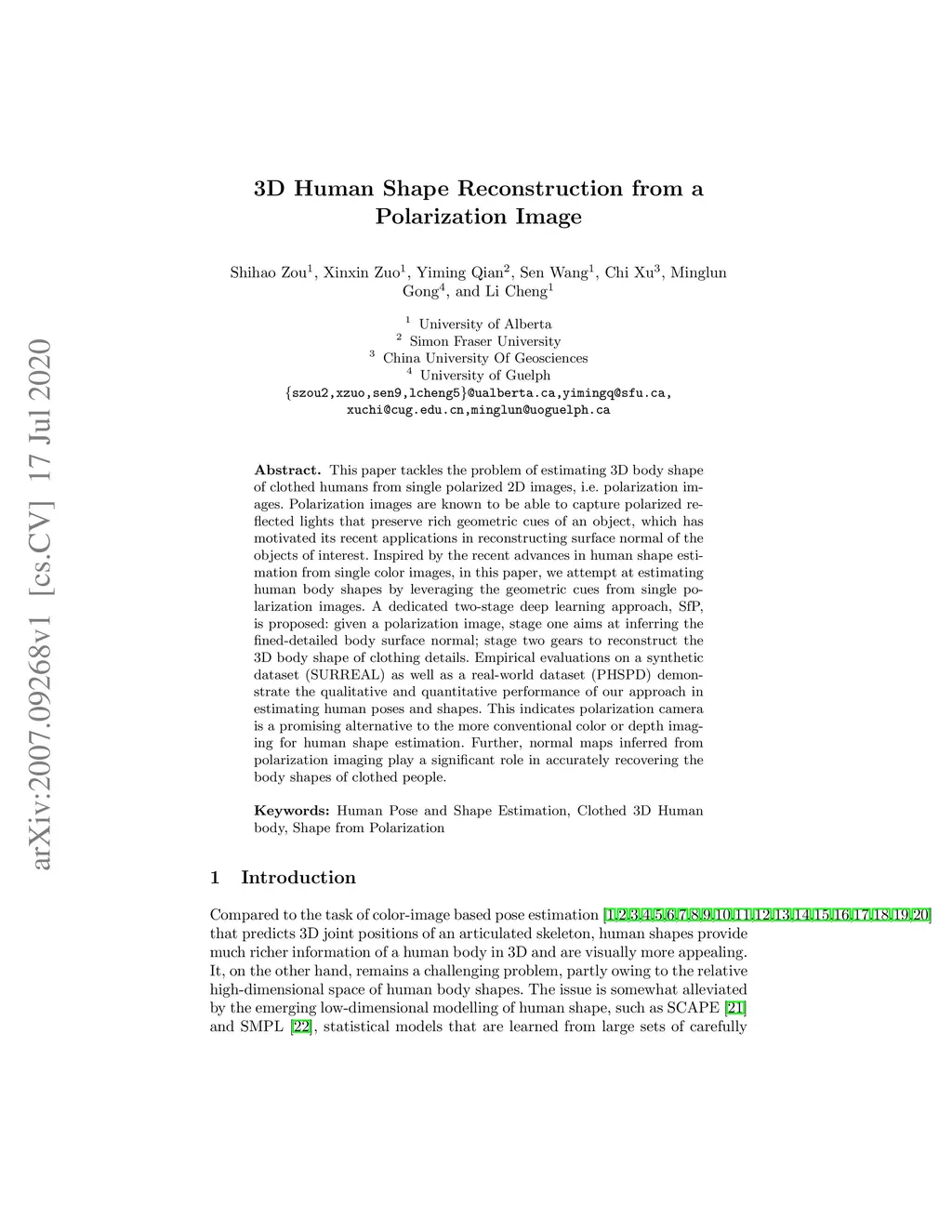 This paper tackles the problem of estimating 3D body shape of clothed humans from single polarized 2D images, i.e. polarization images. Polarization images are known to be able to capture polarized reflected lights that preserve rich geometric cues of an object, which has motivated its recent applications in reconstructing surface normal of the objects of interest. Inspired by the recent advances in human shape estimation from single color images, in this paper, we attempt at estimating human body shapes by leveraging the geometric cues from single polarization images. A dedicated two-stage deep learning approach, SfP, is proposed: given a polarization image, stage one aims at inferring the fined-detailed body surface normal; stage two gears to reconstruct the 3D body shape of clothing details. Empirical evaluations on a synthetic dataset (SURREAL) as well as a real-world dataset (PHSPD) demonstrate the qualitative and quantitative performance of our approach in estimating human poses and shapes. This indicates polarization camera is a promising alternative to the more conventional color or depth imaging for human shape estimation. Further, normal maps inferred from polarization imaging play a significant role in accurately recovering the body shapes of clothed people.